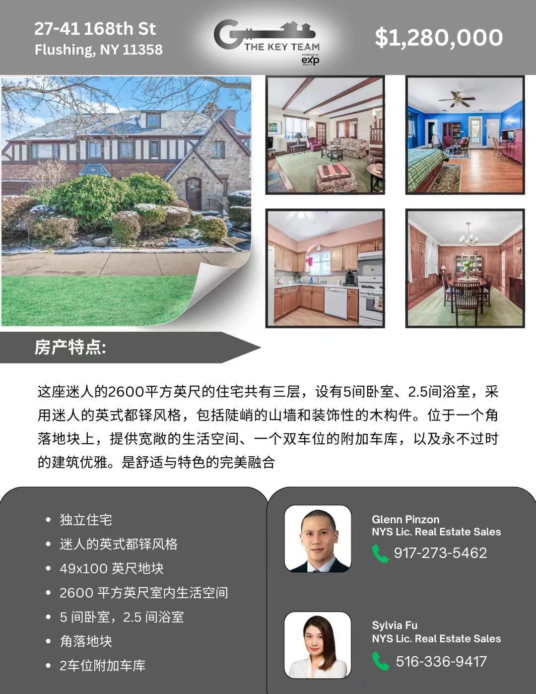 纽约法拉盛房屋出售 Flushing NY新上市法拉盛房子出售法拉盛豪华住宅独家出售买卖 今天下午3-4点看房🎉最新独家代理🌟欢迎合作转发🔥北法拉盛11358大型一家庭Tudor 售$1,280,000🏠27-41 168St,Flushing,NY 11358👍地49x100,街角ZoningR2A 地面三层加地下室,总面积2610呎,5房2.5浴 绝不可错过❗️