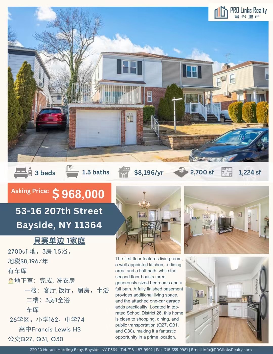 纽约贝赛房子出售Bayside NY新上市 贝赛房屋出售贝赛豪华住宅出售独家代理买卖🔥新上市貝赛单边1家庭🧧售96万82700sf 地,3房 1.5浴, 地税$8,196/年 有车库🏠地下室:完成, 洗衣房