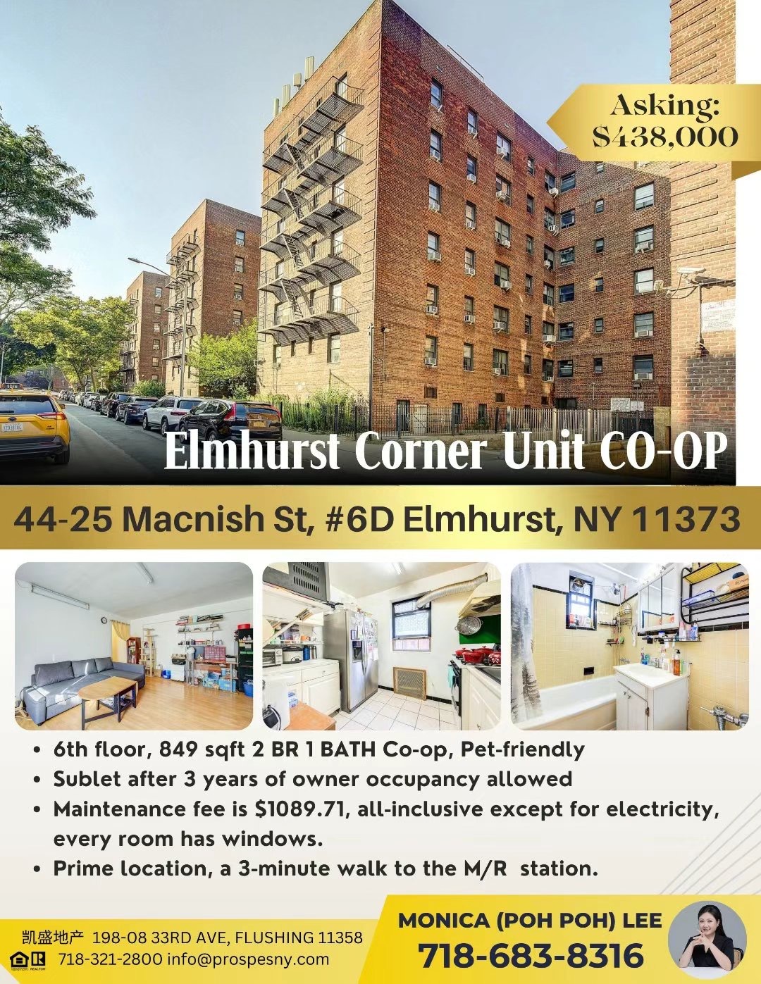 🔵Elmhurst 849尺2房Co-op,宠物友好,自住3年后可以出租