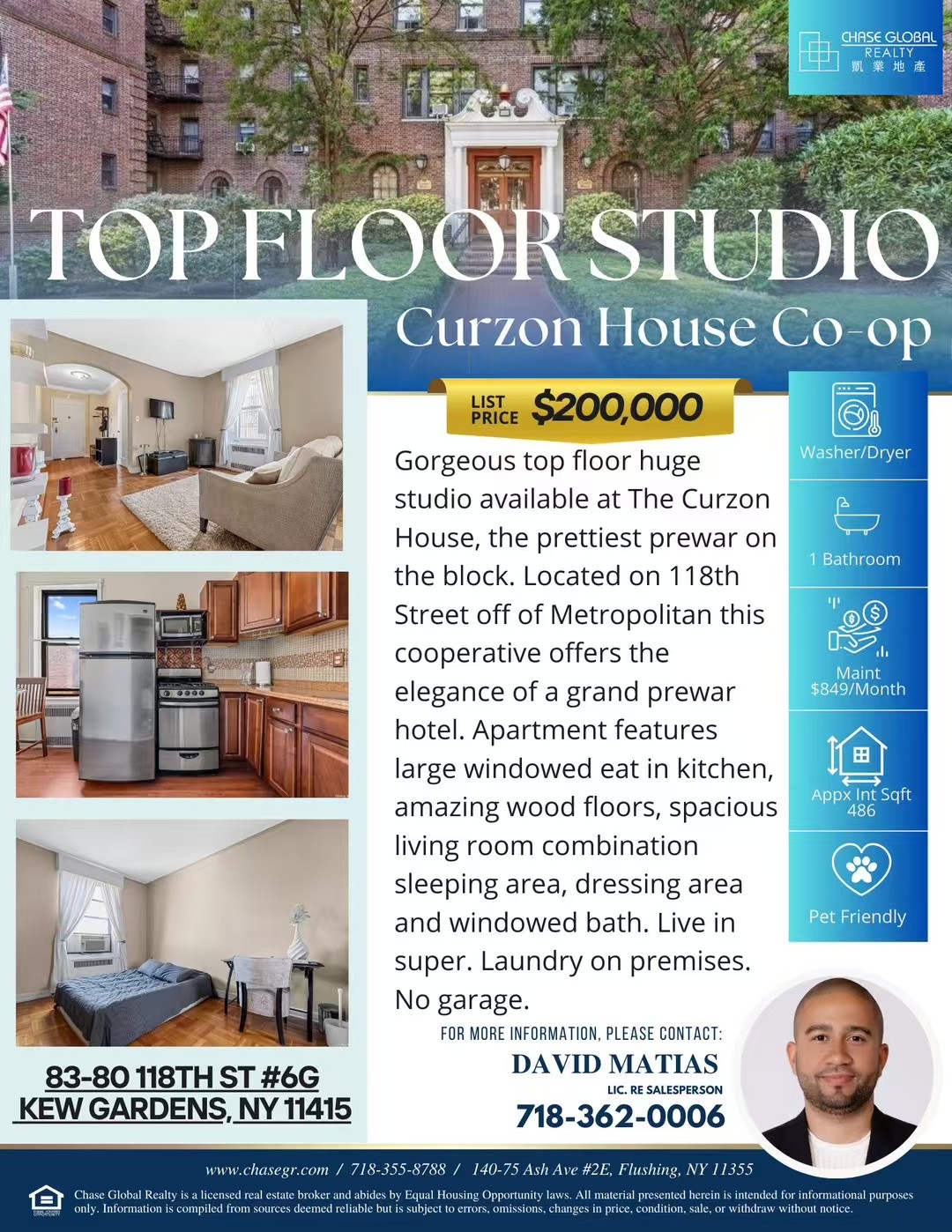 纽约皇后区秋园房子出售Kew Gardens Queens NY新上市秋园房屋独家出售买卖🌟 Kew Gardens顶层Studio合作公寓 🌟