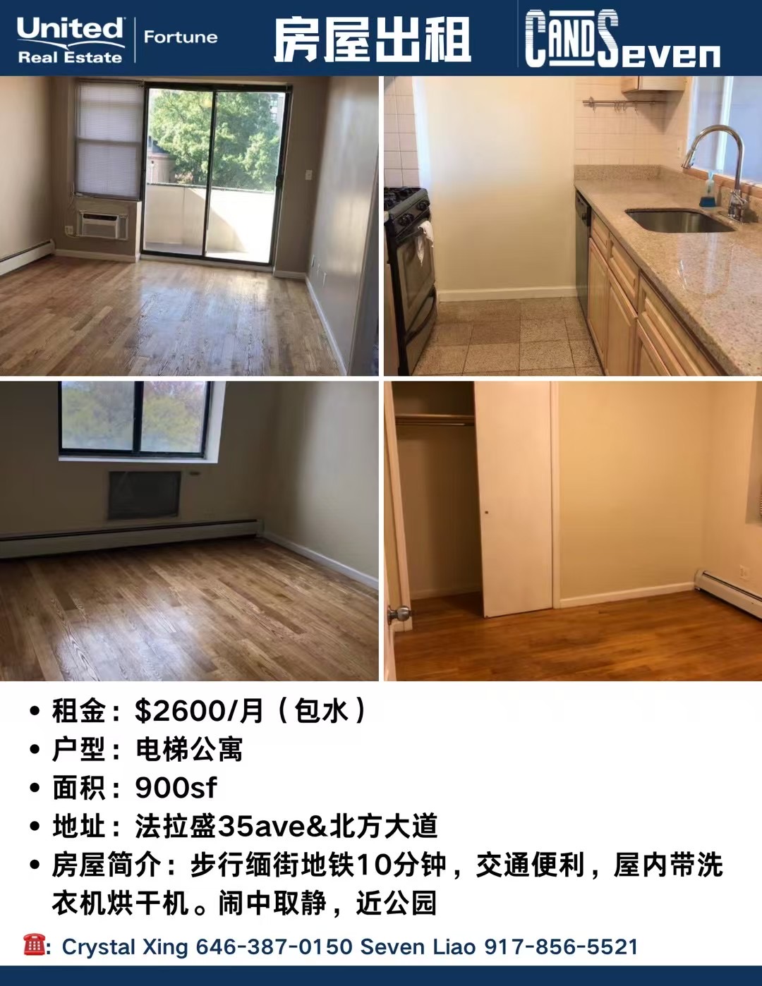 纽约法拉盛豪华公寓出租Flushing Coop NY新上市法拉盛合作公寓大楼出租 法拉盛电梯公寓35ave近main街7号地铁,超市和公园,闹中取静。高层有电梯、阳台、独立室内洗烘机,生活交通便利。租$2600包水。需信用调查电话:917-856-5521