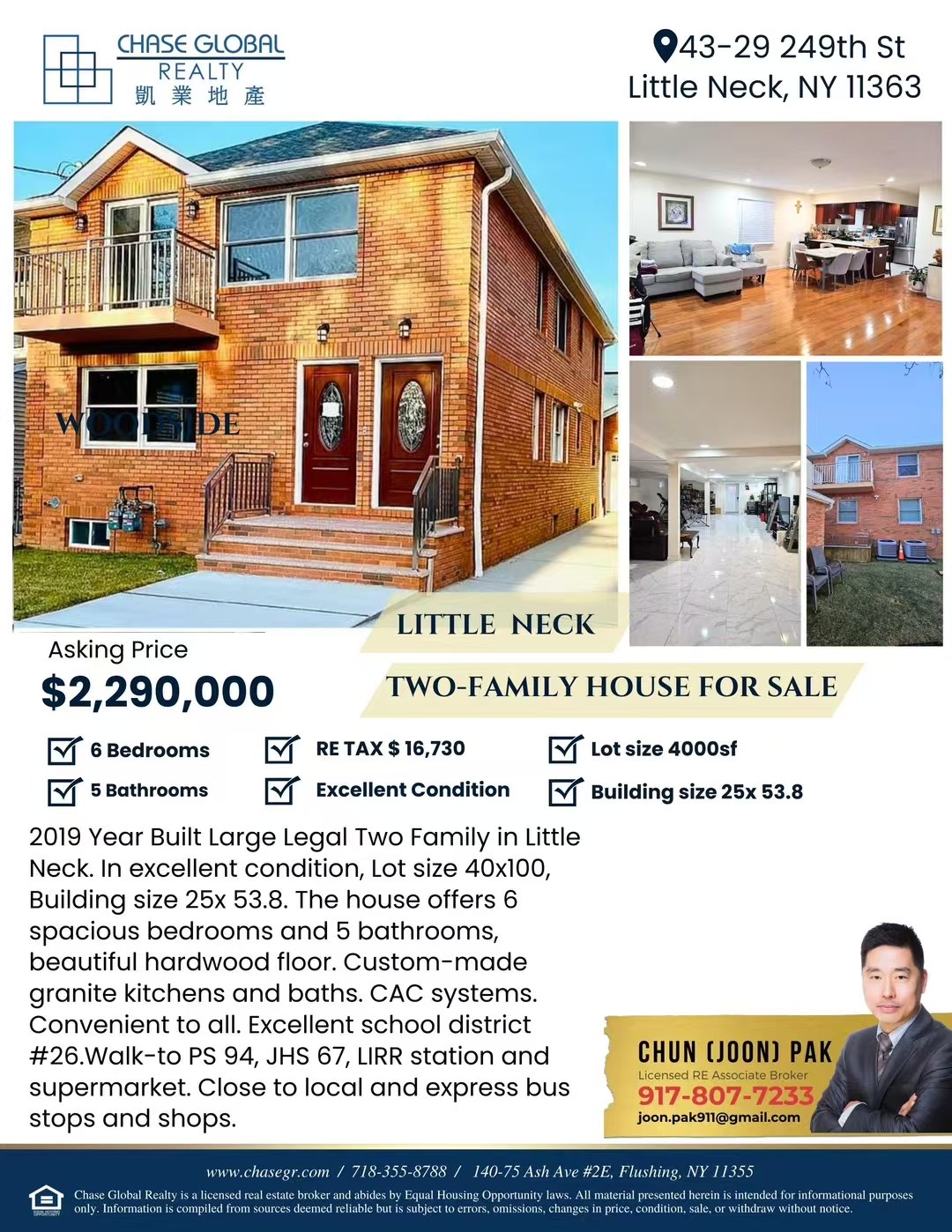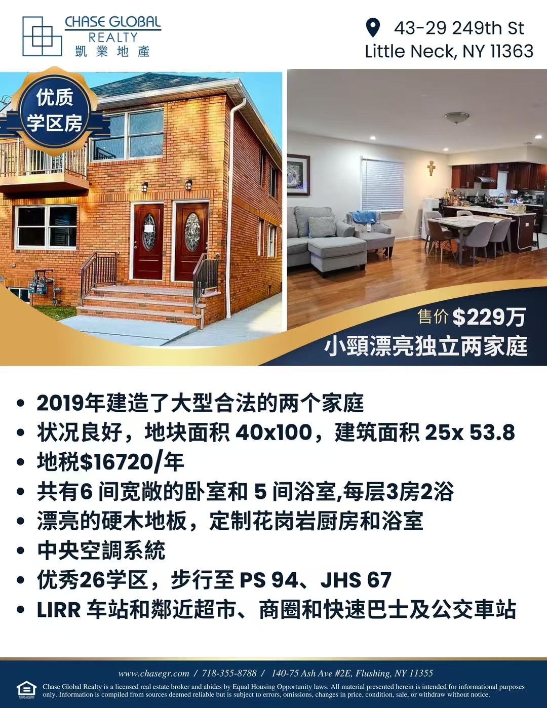 纽约小颈房子出售Little Neck NY 新上市小颈房屋出售小颈豪宅独家出售买卖🔥凯业地产全新房源小頸漂亮独立全砖两家庭出售$229万🔥