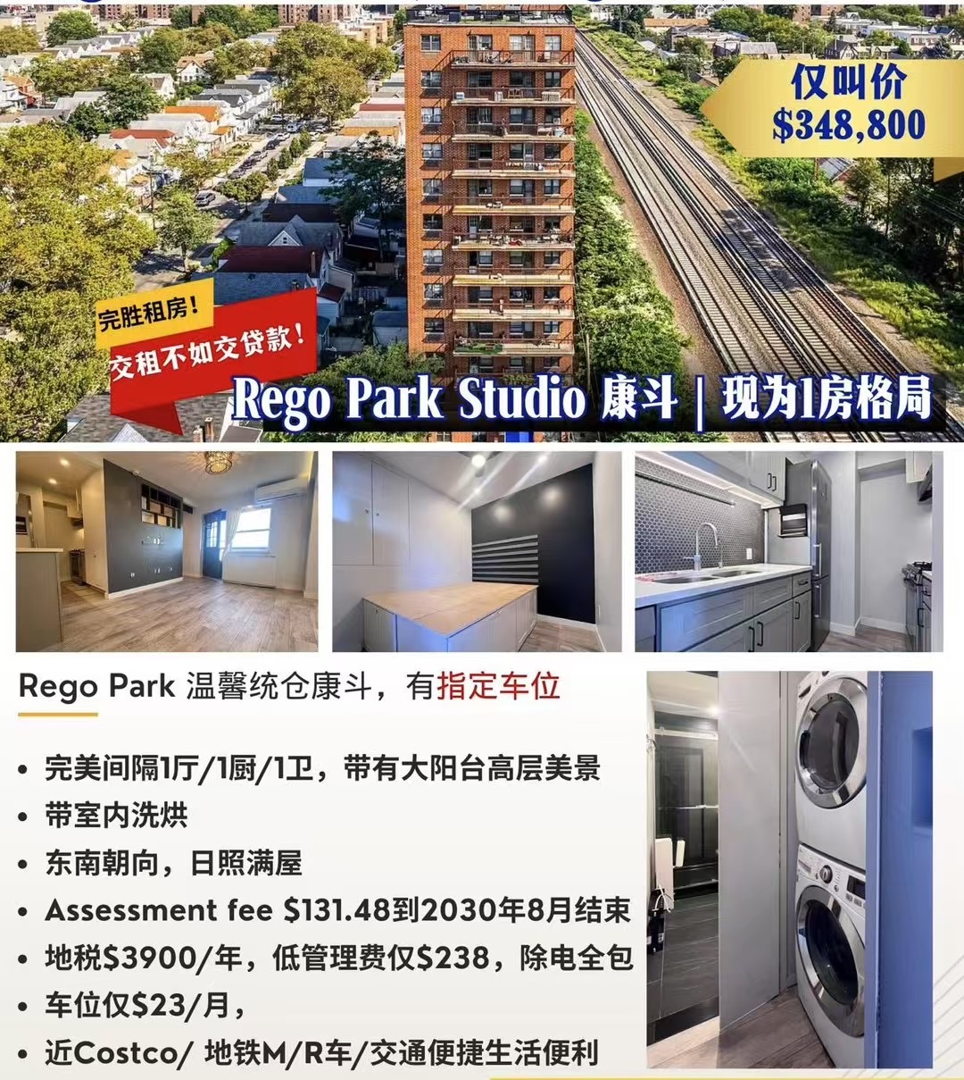 纽约雷哥公园豪华康斗出售Rego Park Condo NY新上市雷哥公园合作康斗出售雷哥公园豪华康斗独家出售买卖💎#RegoPark 温馨统仓康斗完美间隔1房(Queen size bed)/1厅/1厨/1卫,有室内洗烘,有大阳台东南朝向高层美景可观日出/日照满屋,还有一个指定车位。💎近Costco/ 地铁M/R车/交通方便近一切…🔥🔥仅售$34万8千8,完胜租房[强][强][强]💎地税$3900/年,管理费$238,车位$ 23,Assessment fee $131.48, 到2030年8月结束。合计$392.48/月。除电全包,包暖气!欢迎约看📲6466458950