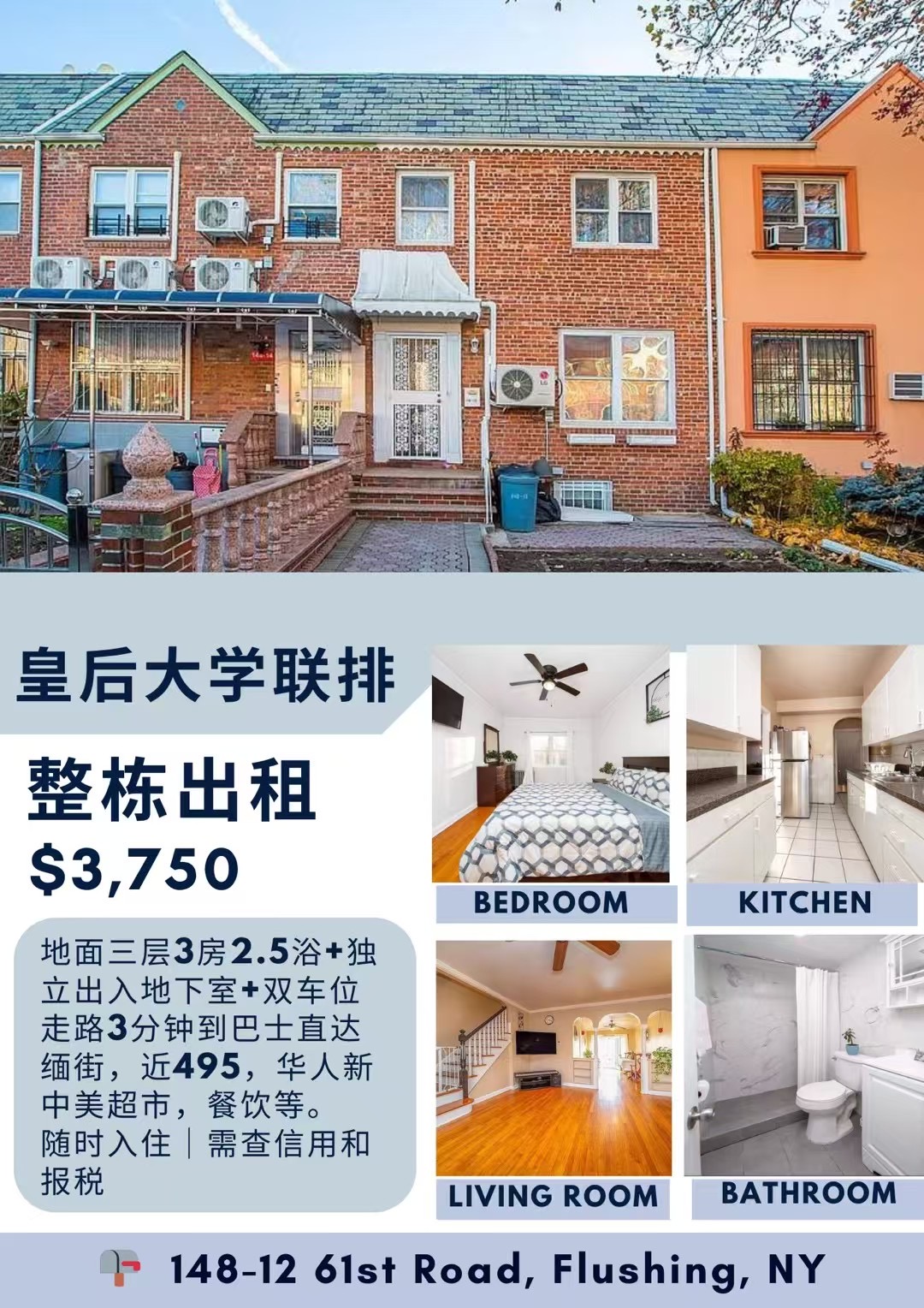 法拉盛租房 法拉盛房子出租Flushing NY 新上市纽约法拉盛房屋出租网法拉盛住宅租赁 欢迎经纪小伙伴们入群 ,一起合作!🌃法拉盛皇后大学联排整栋出租带双车位🌃
