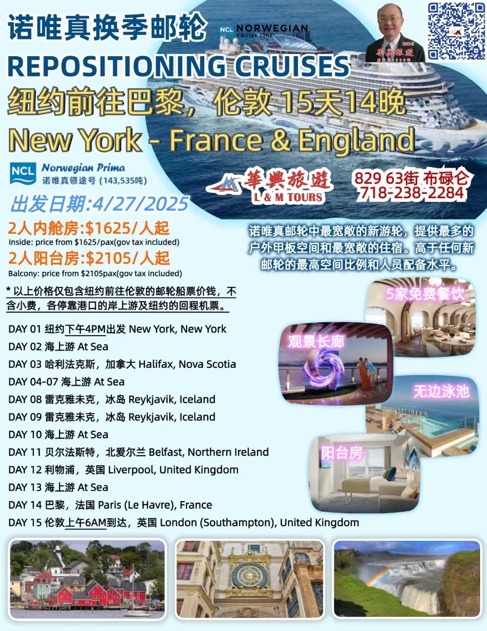 *以上价格仅包含纽约前往伦敦的邮轮船票价钱,不含小费,各停靠港口的岸上游及纽约的回程机票。