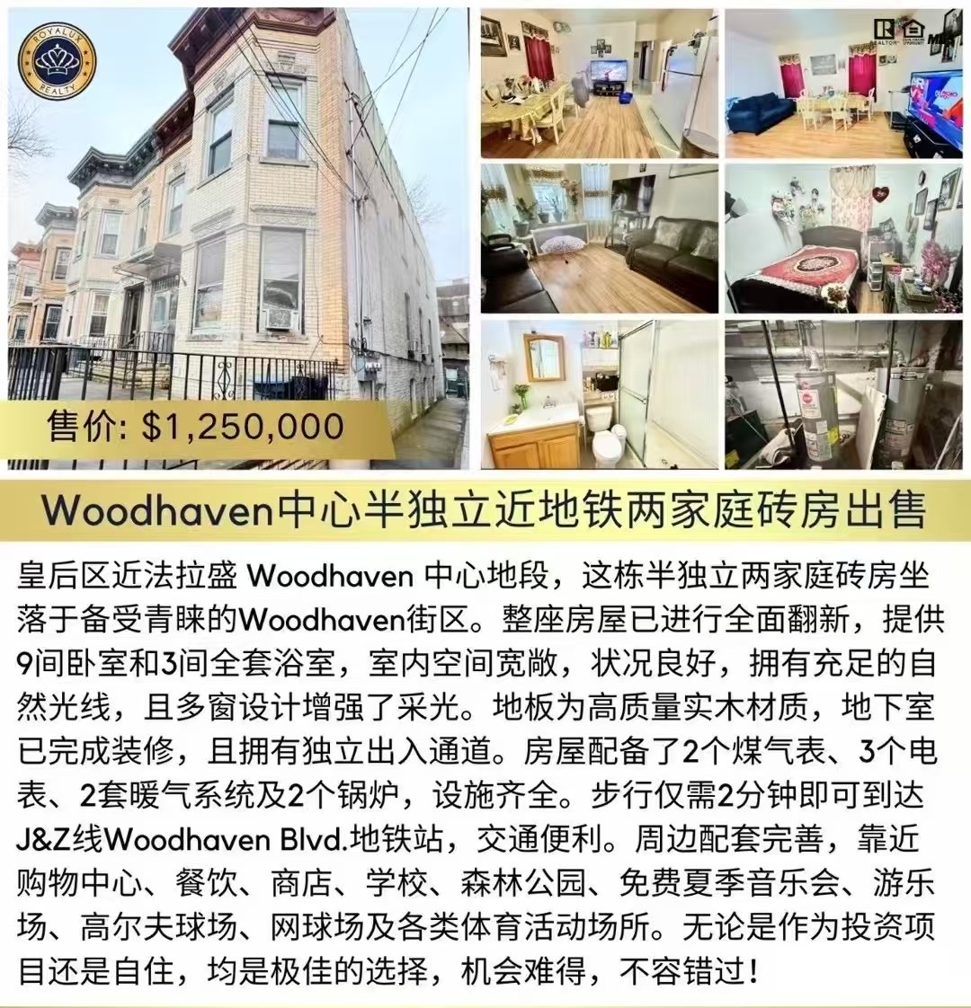 皇后区近法拉盛 Woodhaven 中心地段,这栋半独立两家庭砖房坐落于备受青睐的Woodhaven街区。整座房屋已进行全面翻新,提供9间卧室和3间全套浴室,室内空间宽敞,状况良好,拥有充足的自然光线,且多窗设计增强了采光。地板为高质量实木材质,地下室已完成装修,且拥有独立出入通道。房屋配备了2个煤气表、3个电表、2套暖气系统及2个锅炉,设施齐全。步行仅需2分钟即可到达J&Z线Woodhaven Blvd 地铁站,交通便利。周边配套完善,靠近购物中心、餐饮、商店、学校、森林公园、免费夏季音乐会、游乐场、高尔夫球场、网球场及各类体育活动场所。无论是作为投资项目还是自住,均是极佳的选择,机会难得,不容错过!