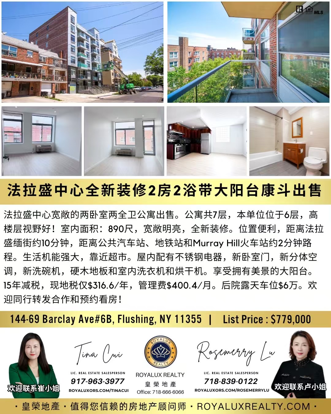 👑皇荣地产新上市独家代理好房源 纽约法拉盛豪华康斗出售Flushing Luxury Condo NY 新上市法拉盛高档康斗出售法拉盛豪华康斗独家预售买卖 👑法拉盛中心全新装修2房2浴带大阳台康斗出售| 售价$77.9万👑康斗介绍:法拉盛中心宽敞的两卧室两全卫公寓出售。公寓共7层,本单位位于6层,高楼层视野好!室内面积:890尺,宽敞明亮,全新装修。位置便利,距离法拉盛缅街约10分钟,距离公共汽车站、地铁站和Murray Hill火车站约2分钟路程。生活机能强大,靠近超市。屋内配有不锈钢电器,新卧室门,新分体空调,新洗碗机,硬木地板和室内洗衣机和烘干机。享受拥有美景的大阳台。15年减税,现地税仅$316.6/年,管理费$400.4/月。后院的露天车位$6万。欢迎同行转发合作和预约看房!