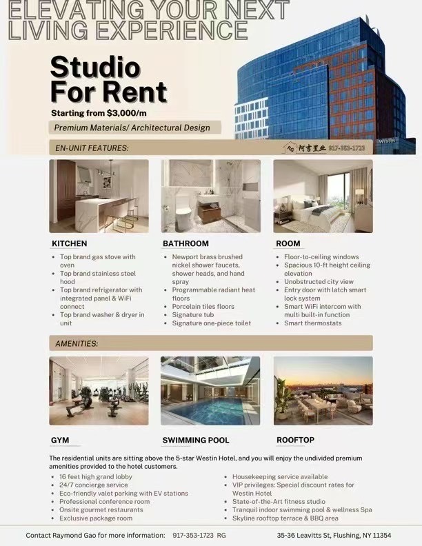35-36 Leavitts St, Flushing, NY 11354🪧出租 Studio Unit📦预计2025年3月可入住💵$3,000/m 起租,签约1年,提供1个月免租;签约2年,提供2个月免租