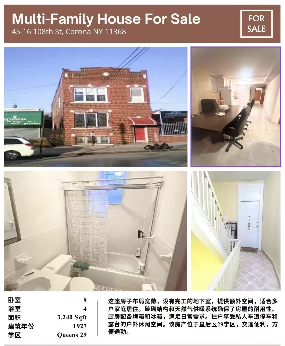 纽约可乐娜房子出售Corona NY 新上市可乐娜房屋住宅出售可乐娜豪宅独家出售买卖收租投资 未来纽约赌场新标地