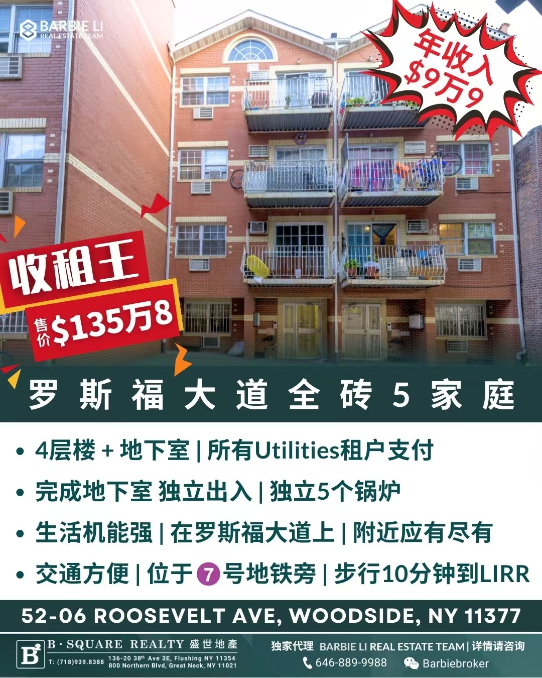 纽约皇后区木边房子出售Woodside Queens NY新上市木边房屋独家出售买卖🆕 罗斯福大道全砖5家庭