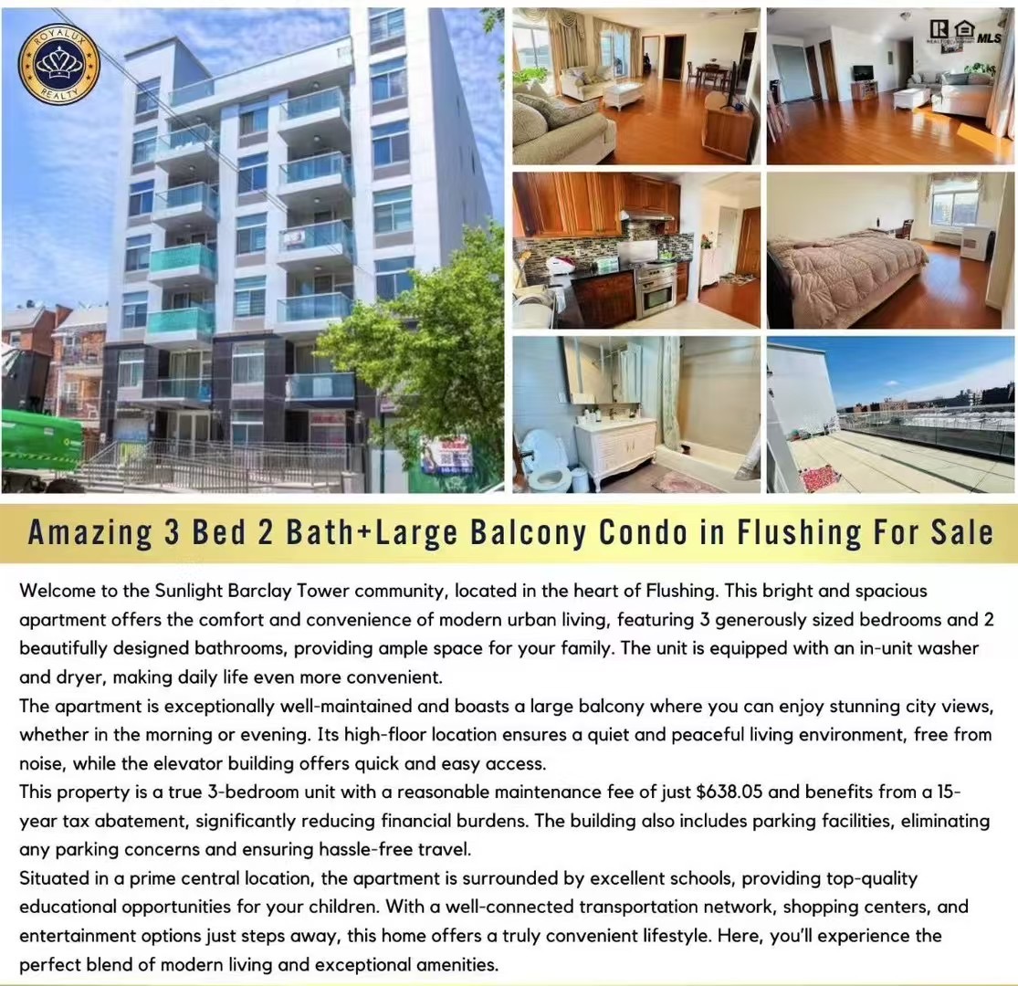 欢迎来到Sunlight Barclay Tower社区,位于法拉盛中心地段,这套明亮的公寓为您提供现代都市生活的舒适与便利,设有3间宽敞卧室和2间精美浴室,为您的家庭提供充足的生活空间,并配备屋内洗烘机,让日常生活更加便捷。公寓保养一流,配有超大阳台,无论是清晨还是傍晚,您都可以在此享受城市美景;高楼层位置远离噪音,确保宁静的生活环境,同时作为电梯公寓,您将享受快捷便利的上下楼体验。该物业为正式三房,管理费合理仅$638.05,并享有长达15年的减税优惠,大大减轻财务负担,大楼内还配有车位,彻底解决停车问题,确保出行无忧。公寓坐落在城市中心地段,交通网络发达,出行极其便利,周围分布着多所优秀学校,为孩子提供优质教育资源,同时购物、娱乐设施近在咫尺,为您打造便捷的生活方式。在这里,您将体验到现代生活与便利设施完美融合的极致享受。📲约看请联系负责经纪:Joanne Wu 917-853-4795