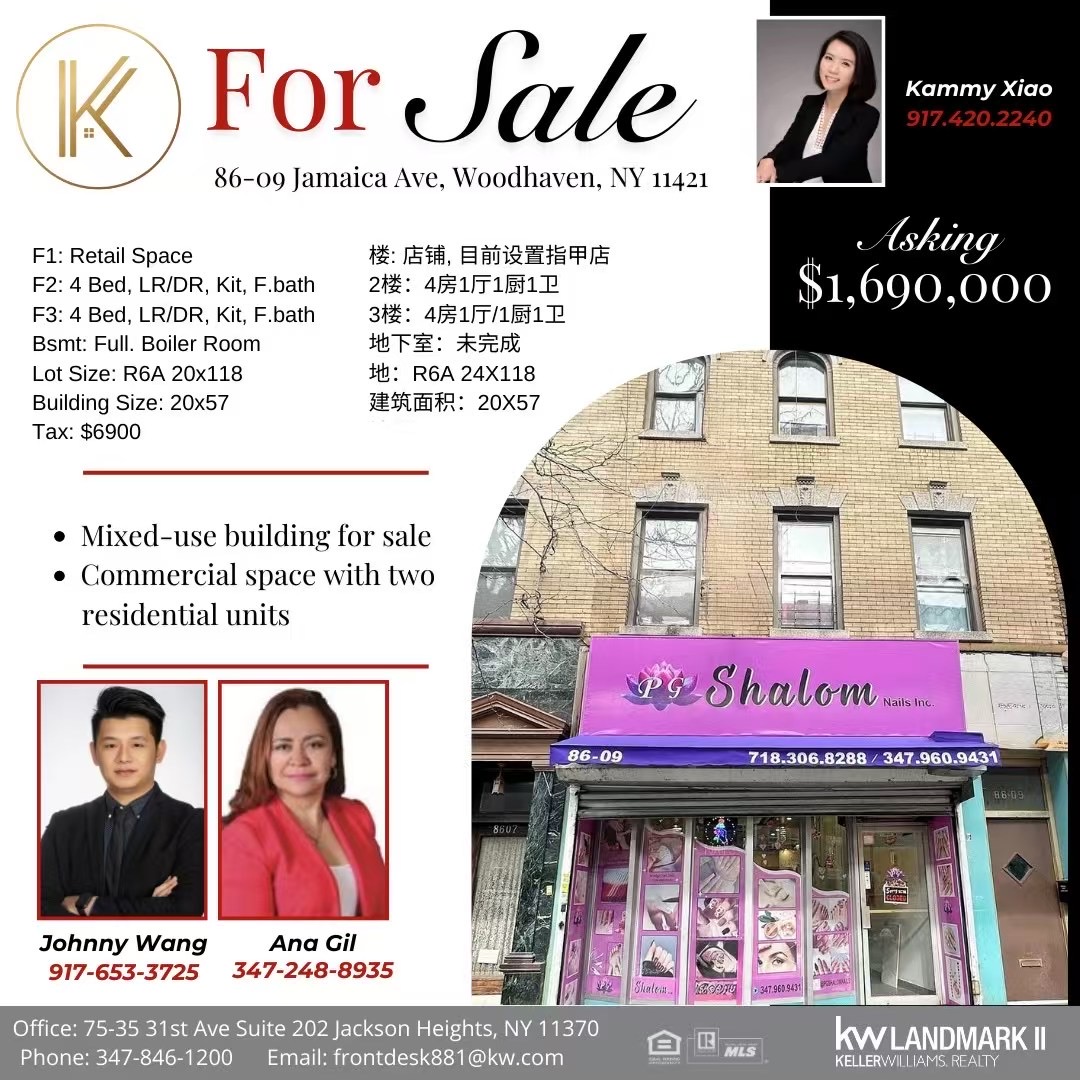 💥Jamaica Ave商业楼独家上市💥店铺+两住家各4房1厅、8609 Jamaica Ave Woodhaven , 地税7千不到、建筑面积20×57、叫价169万,详情请联系肖小姐9174204420
