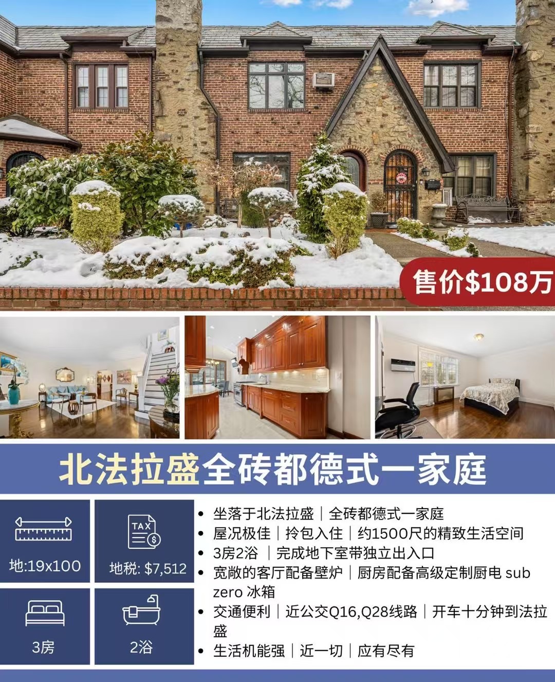 纽约法拉盛房屋出售 Flushing NY新上市法拉盛房子出售法拉盛豪华住宅独家出售买卖 👏🏼重磅推出 北法拉盛黄金地段🪄Tudor风精装联一排家庭💰108万💎3房2浴,客厅有设壁炉地,下室独立出入☀使面用积1500尺 顶级厨电配置Sub Zero冰箱💎配备☀阳光dining area连接后院💫独车立库车道 交通便利3473995873