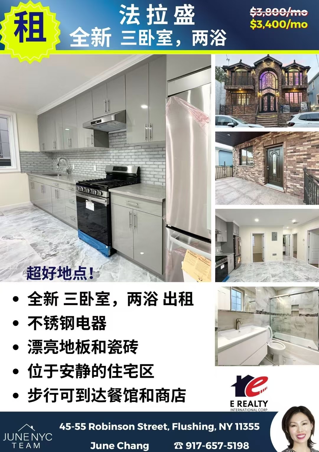 法拉盛租房 法拉盛房子出租Flushing NY 新上市纽约法拉盛房屋出租网法拉盛住宅租赁 💎全新3房2浴租法拉盛近餐馆超市学校!机会难得!$3400