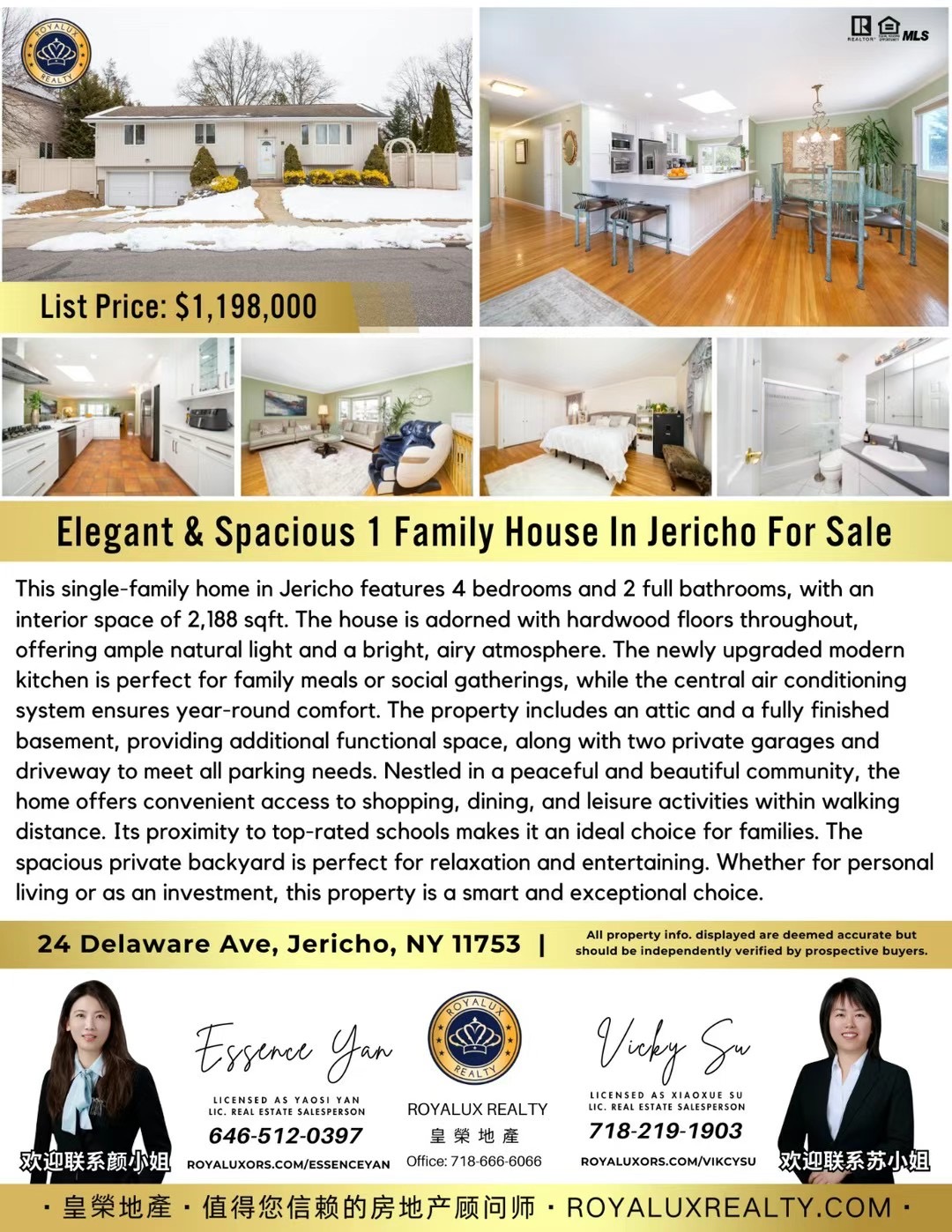 这栋位于Jericho的一家庭独栋别墅,拥有4间卧室和2间全浴室,室内面积达2188 sqft,全屋铺设实木地板,采光充足,空间明亮。全新升级的厨房设计现代,适合家庭聚餐或社交娱乐,中央空调系统确保四季舒适。房屋配备阁楼和已完工的地下室,提供额外功能空间,私家车库和车道则解决了停车需求。社区环境优美宁静,生活便利,步行即可到达购物、餐饮和休闲场所。临近优质学区,教育资源丰富,是家庭居住的理想选择。宽敞的私人庭院为您提供放松和聚会的绝佳空间。无论是自住还是投资,这栋房产都将是您的明智之选。欢迎同行转发合作及约看!📲约看请联系负责经纪:Essence 646-512-0397Vicky 718-219-1903
