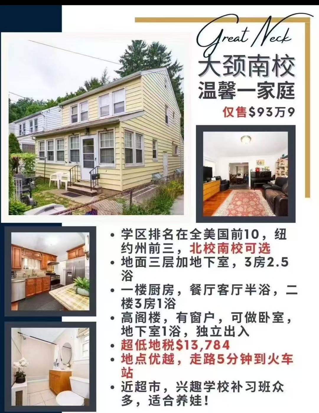 纽约大颈房子出售Great Neck NY新上市大颈房屋出售买卖大颈豪宅独家出售买卖Great Neck学区房 仅售$939,000