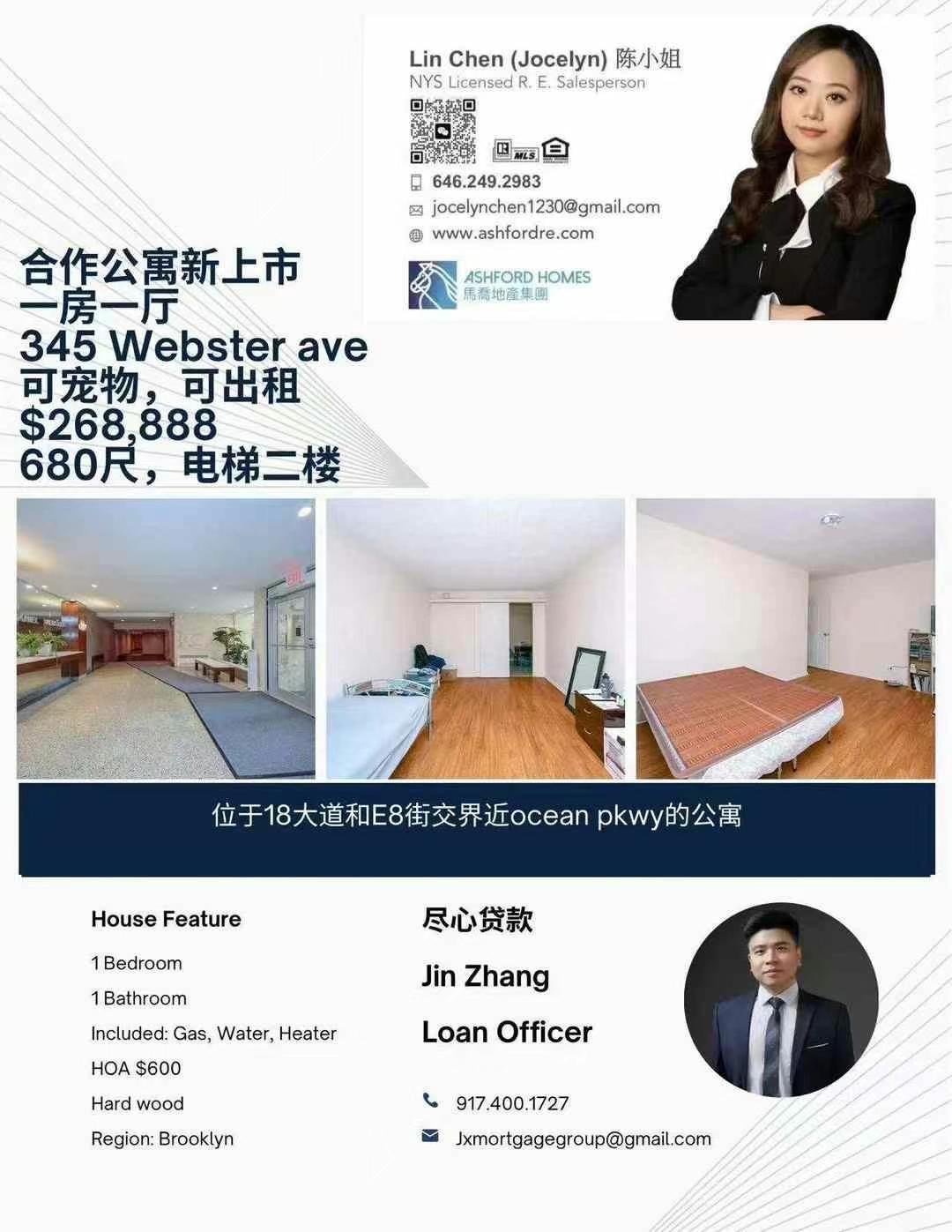 jocelynchen1230@gmail.com www.ashfordre.com一房一厅合作公寓新上市馬喬地產集團 ASHFORD HOMES345 Webster ave可宠物,可出租$268,888