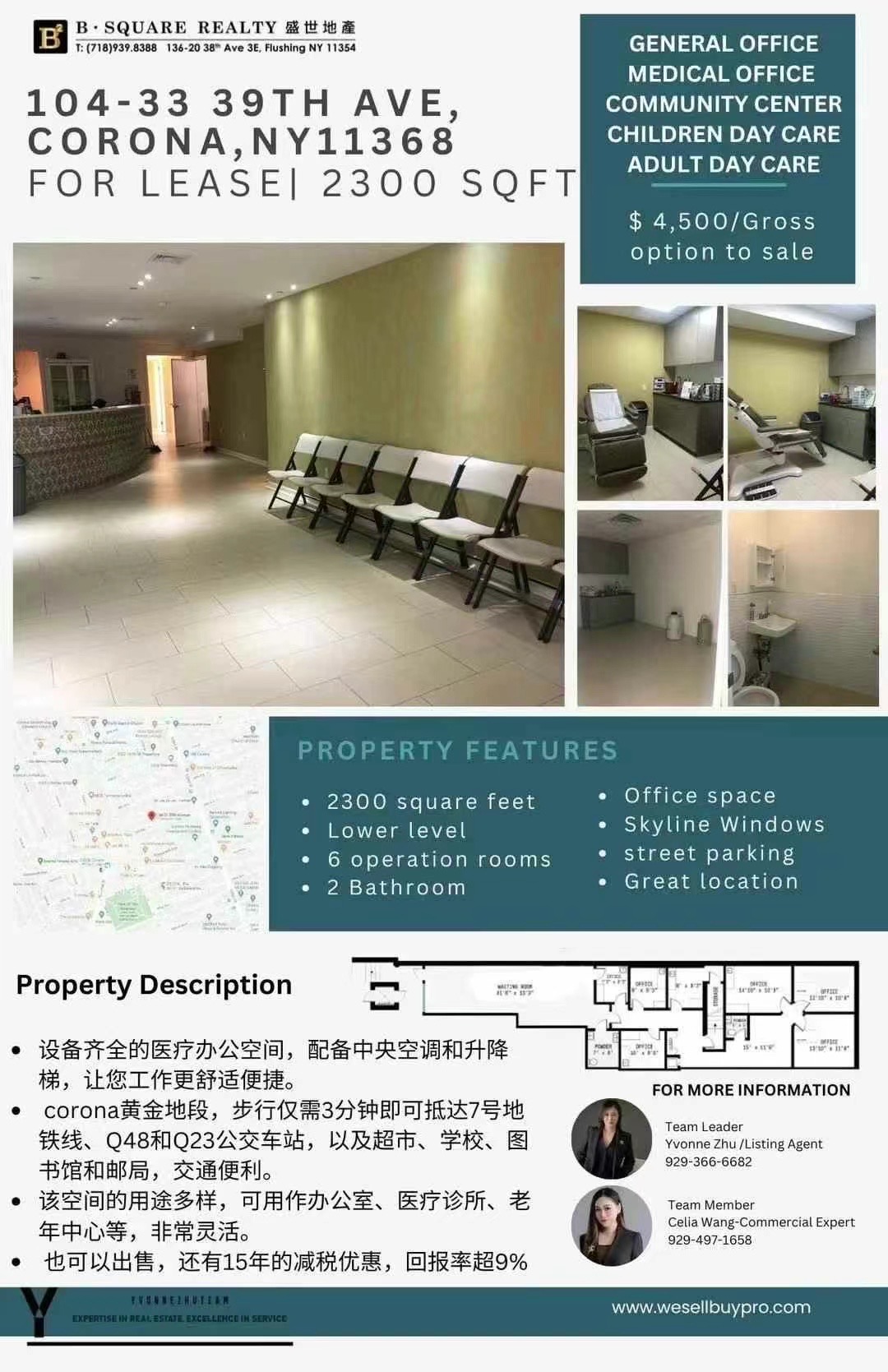 ▪ 以前是皮肤科医生办公室带6个操作间可灵活分割,可用作办公室、幼儿园、医疗诊所、老年中心等,用途多样。