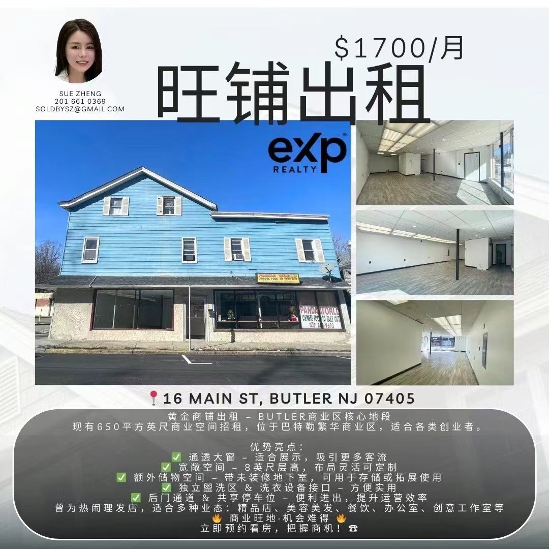 黄金旺铺招租 | 核心商圈·绝佳展示面📍 16 Main St, Butler, NJ 07405💰 $1,700/月 | 650平方英尺