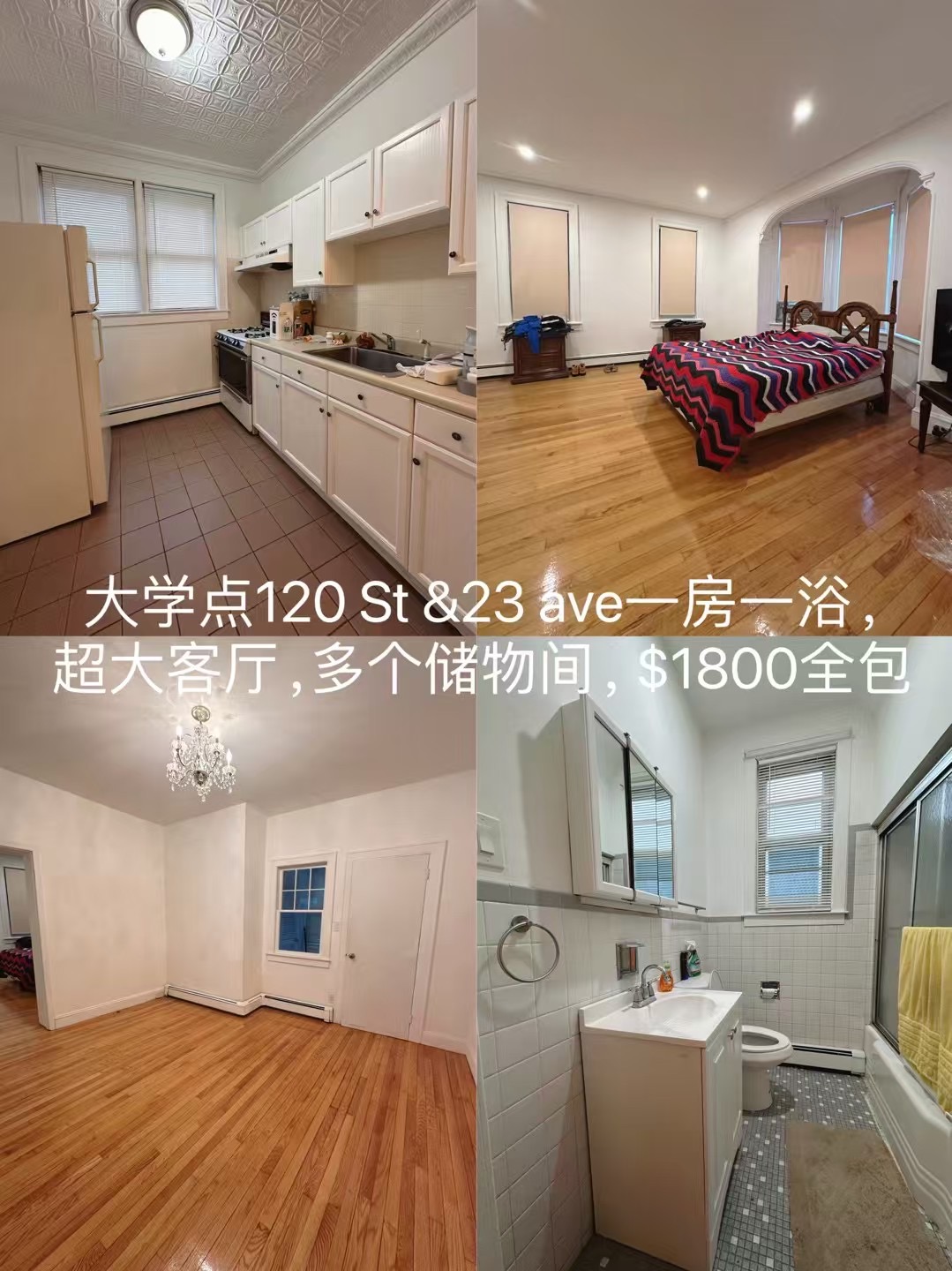 纽约大学点租房College Point NY 新上市大学点房屋住宅🌹出租🌹周三下午5:30点可看房,大学点120 St &23 ave一房一浴,近800尺,超大客厅,多个储物间, $1800全包