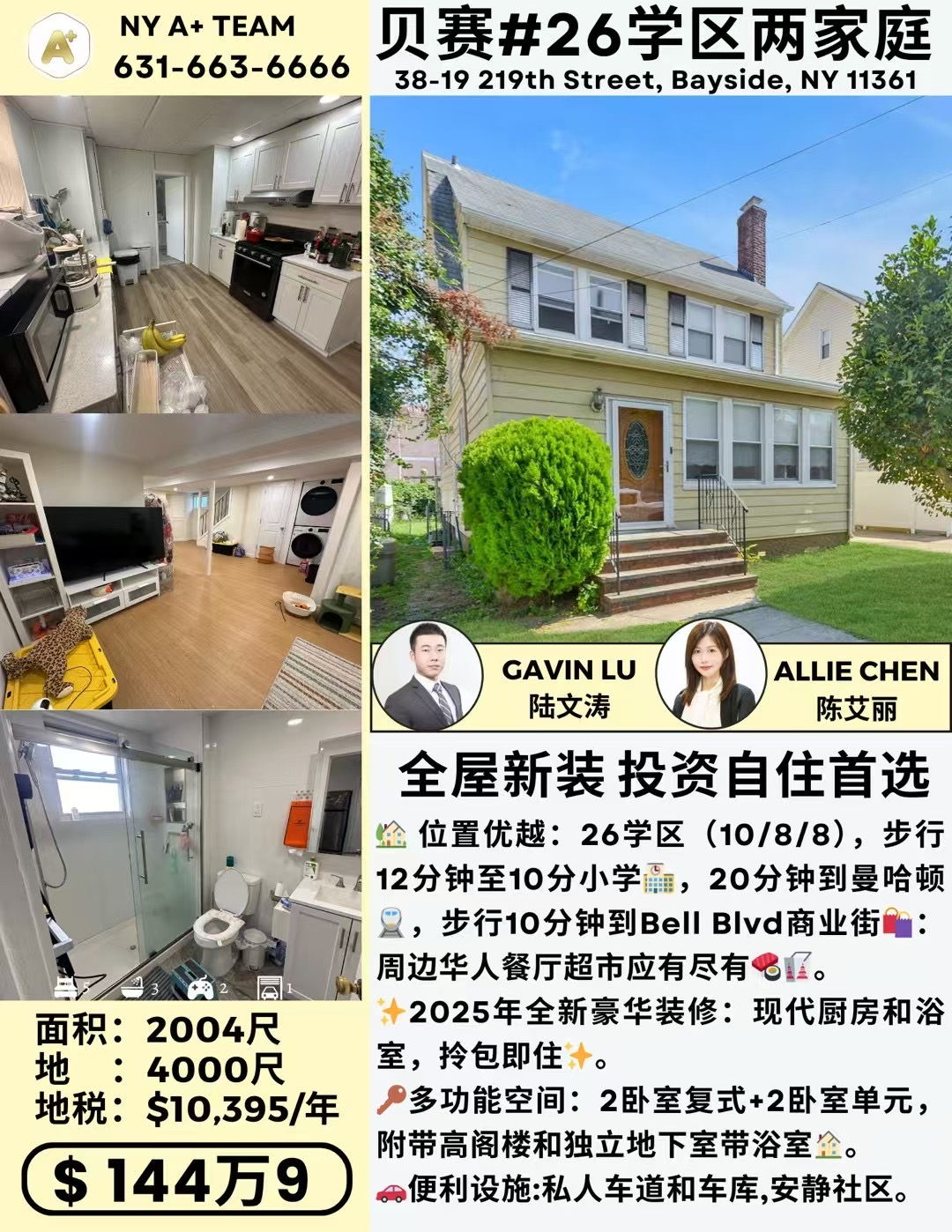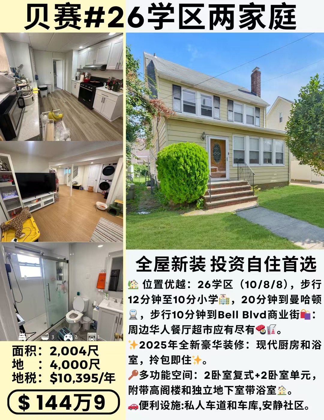 纽约贝赛房子出售Bayside NY新上市 贝赛房屋出售贝赛豪华住宅出售独家代理买卖🏡 贝赛Bell Blvd #26学区两家庭独栋别墅面积:2,004尺 |地 :4,000尺 地税:$10,395/年