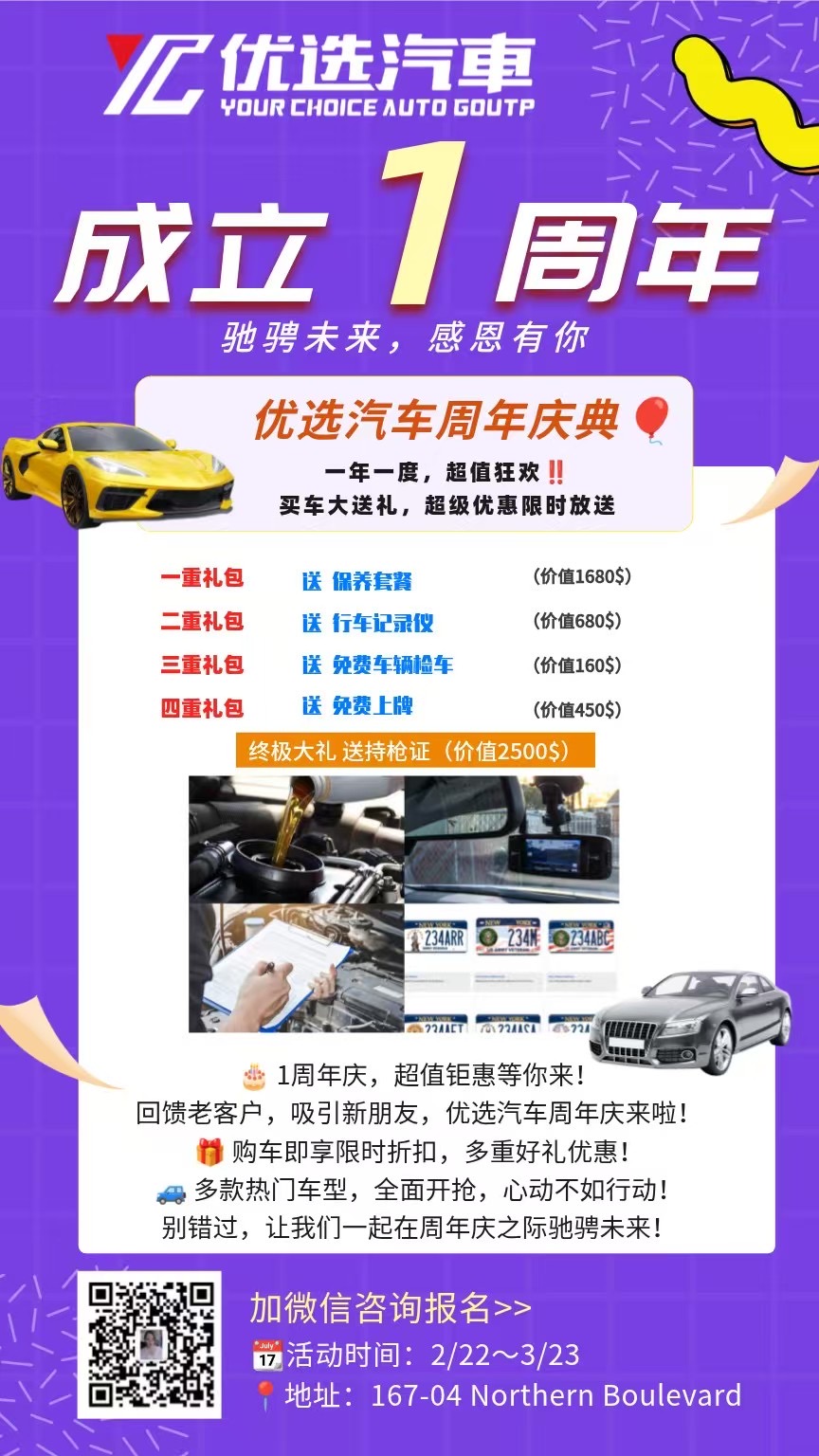 优选汽车-Your Choice Auto Group 法拉盛优选汽车董事长Maggie小余姐姐 929-939-1177 优选汽车华人买卖销售专业好体验 纽约优选汽车二手车过户指南优选汽车为您服务帮您解决所有问题 纽约华人优选汽车买卖金牌销售女神 🎉 一年一度,超值狂欢!🎉优选汽车周年庆典即将来袭!🔥买车送大礼,超级优惠限时放送!💟店庆周签约,朋友圈晒订单送价值2500纽约持枪证‼️不容错过🚗 你想要的车型,我们都有!🔥 限时折扣,保养检测,礼品不停!赶紧锁定日期,和我们一起开启精彩驾乘之旅!💥 每一辆车,都是为你精心挑选!期待与您一起庆祝这一年一度的盛典!📅 活动时间:2月22日至3月23日📍 活动地点:167-04 Northen Boulevard 优选汽车-Your Choice Auto Group 法拉盛优选汽车董事长Maggie小余姐姐 929-939-1177 优选汽车华人买卖销售专业好体验 纽约优选汽车二手车过户指南优选汽车为您服务帮您解决所有问题 纽约华人优选汽车买卖金牌销售女神 联系:Maggie 余小姐 联系电话:929-939-1177 微信:ruru_yu614 法拉盛地址:167-04 Northern Boulevard, FLUSHING NY 11354
