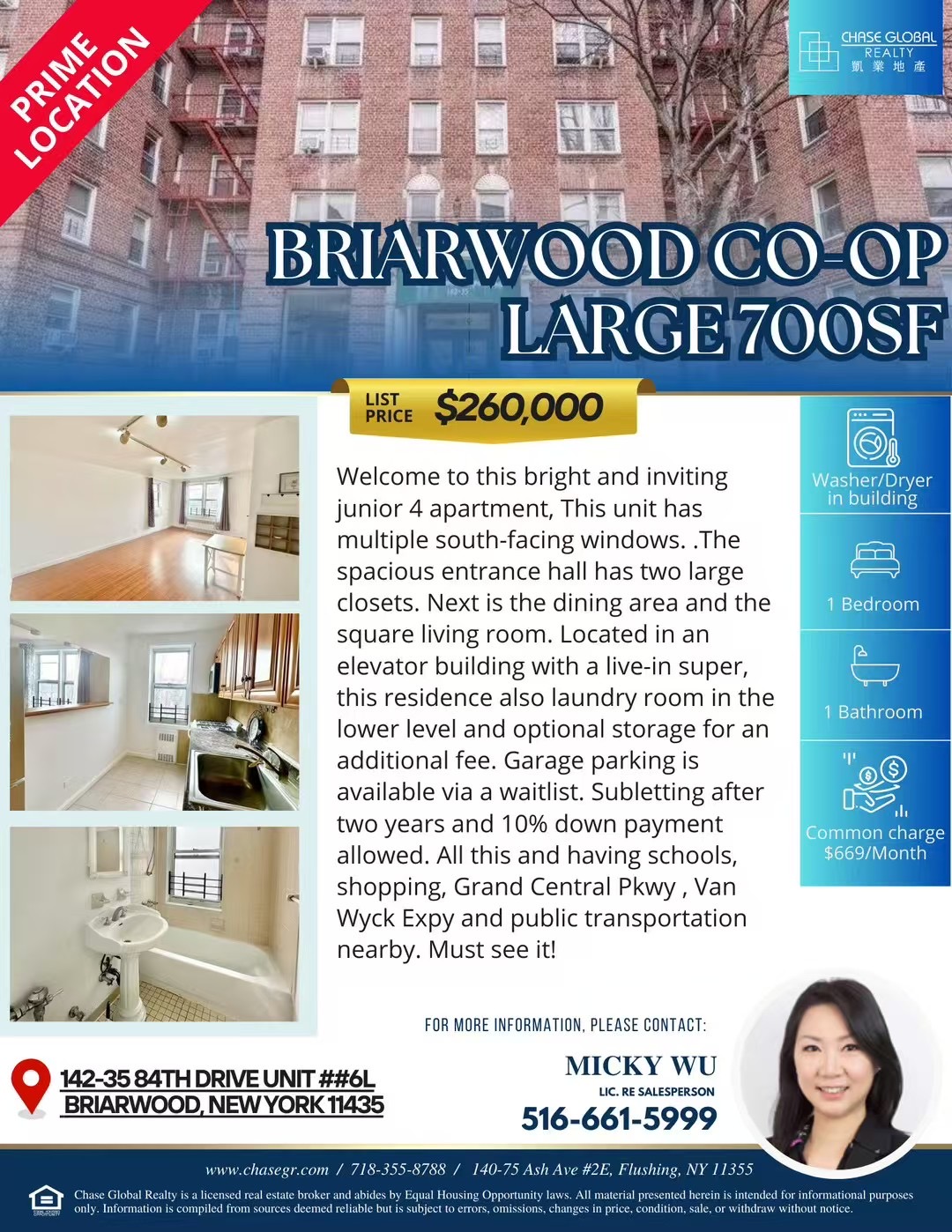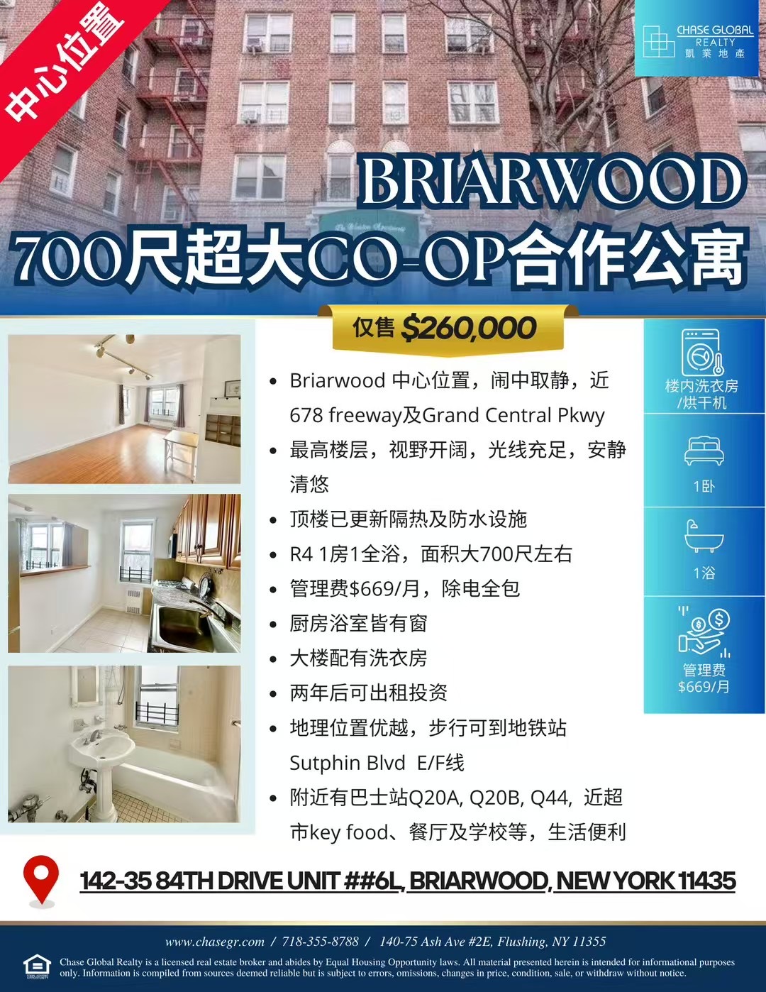 纽约皇后区房子出售买卖网Queens NY Residential新上市皇后区房屋住宅出售网🔥凯业地产全新房源Briarwood Jr4/1房700尺超大CO-OP合作公寓仅售26万🔥