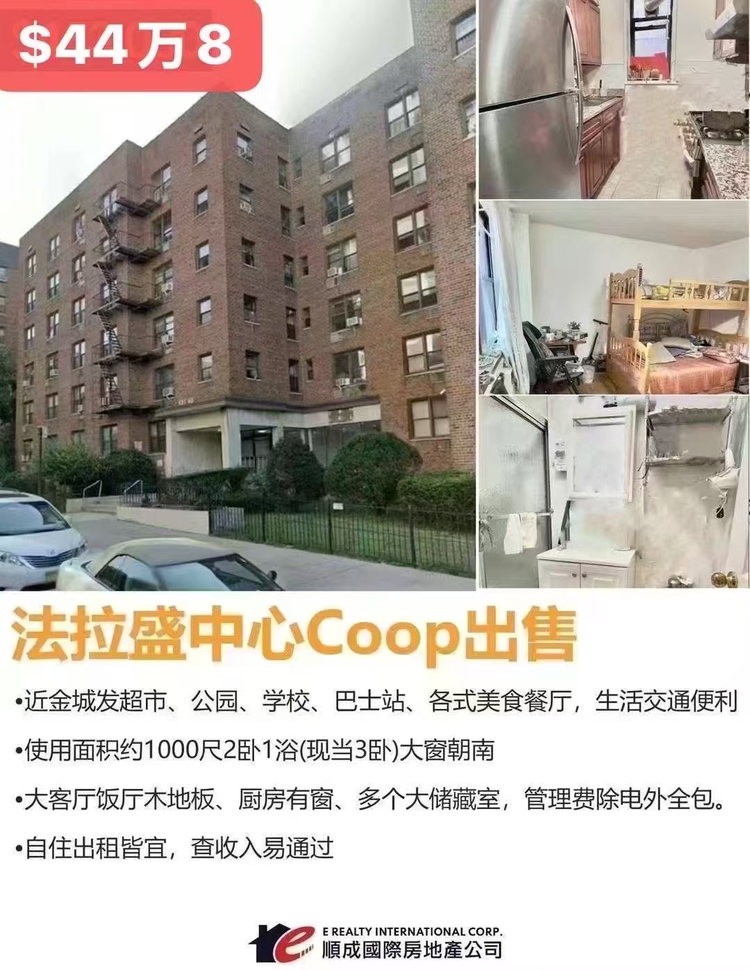 纽约法拉盛豪华公寓出售 Flushing Luxury Coop NY新上市法拉盛高级合作公寓大楼出售法拉盛高大上公寓独家出售买卖 出售:法拉盛Coop易通过[强]特大2卧1浴coop约1000尺,大楼的评级为A100[强],月管理费$1072(除电全包,)格局好厨房有窗,多储藏室多窗光亮状况佳拎包入住,生活便利近一切,随时可约看,现金可优惠