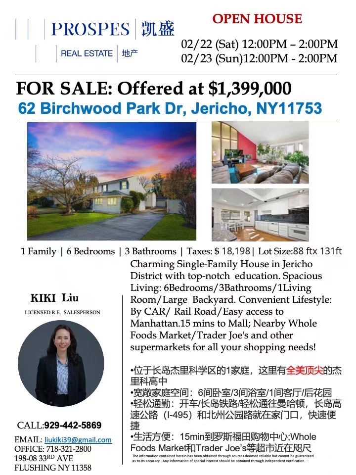 🏡 地址:62 Birchwood Park Dr, Jericho, NY 11753