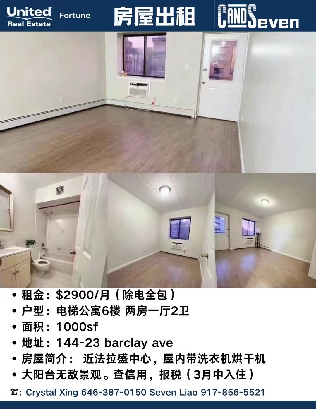 • 地址:144-23 barclay ave•房屋简介:近法拉盛中心,屋内带洗衣机烘干机• 大阳台无敌景观。查信用,报税(3月中入住)