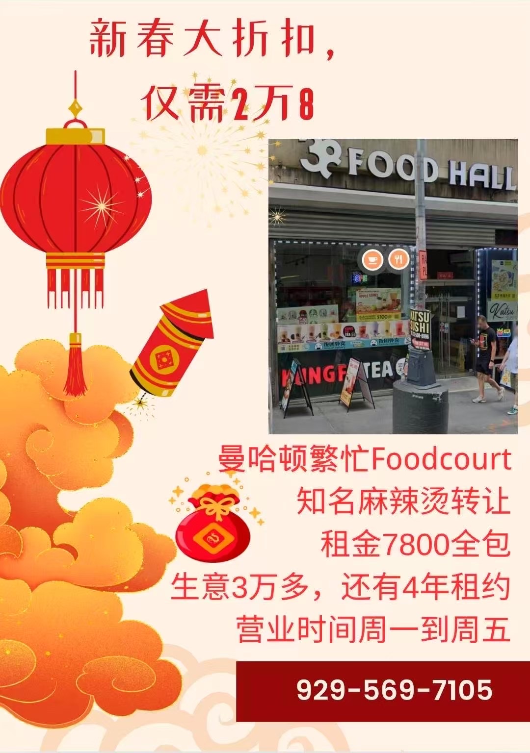纽约餐馆出售转让新上市 纽约生意转让 新上市卖家急售,愿接受任何出价曼哈顿旺Food Court知名麻辣烫转让租金7800全包,生意3万多租约还剩四年多,3%递增