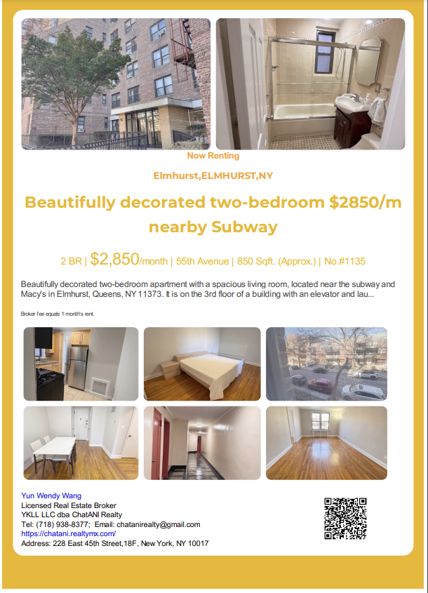 •纽约皇后区Elmhurst地铁附近公寓楼两室一厅$2850/月