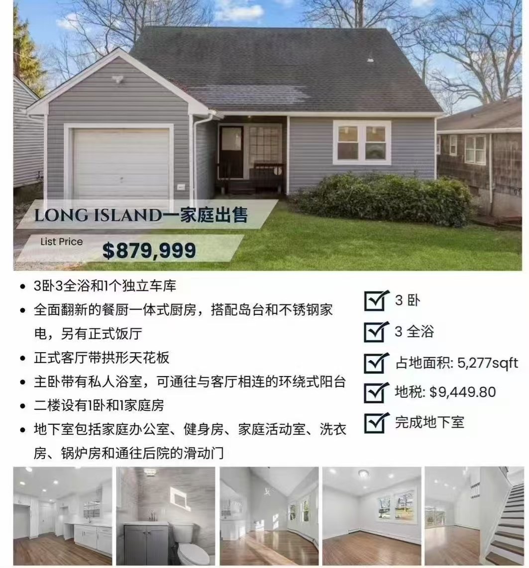 长岛房子出售网Long Island NY新上市长岛房屋住宅出售长岛豪宅独家代理买卖凯业地产Long Island 一家庭出售$879,999