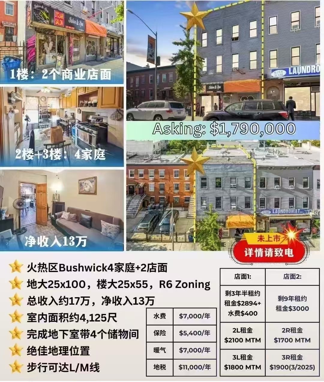 🌟【火热区Bushwick 4家庭+2店面】出售