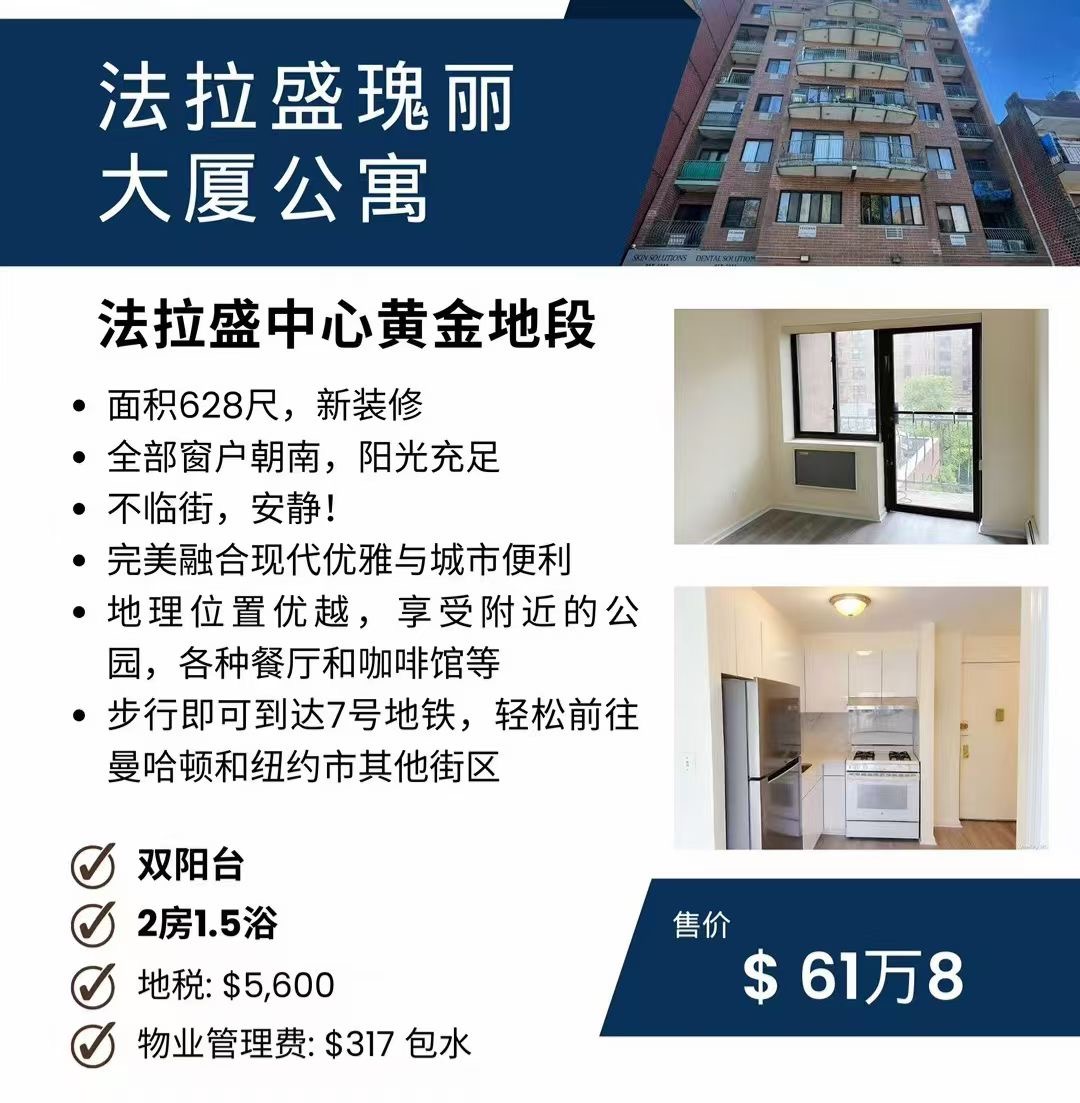 纽约法拉盛豪华公寓出售 Flushing Luxury Coop NY新上市法拉盛高级合作公寓大楼出售法拉盛高大上公寓独家出售买卖 🔥法拉盛瑰丽大厦公寓🏢法拉盛中心黄金地段 🔥 仅售61万8