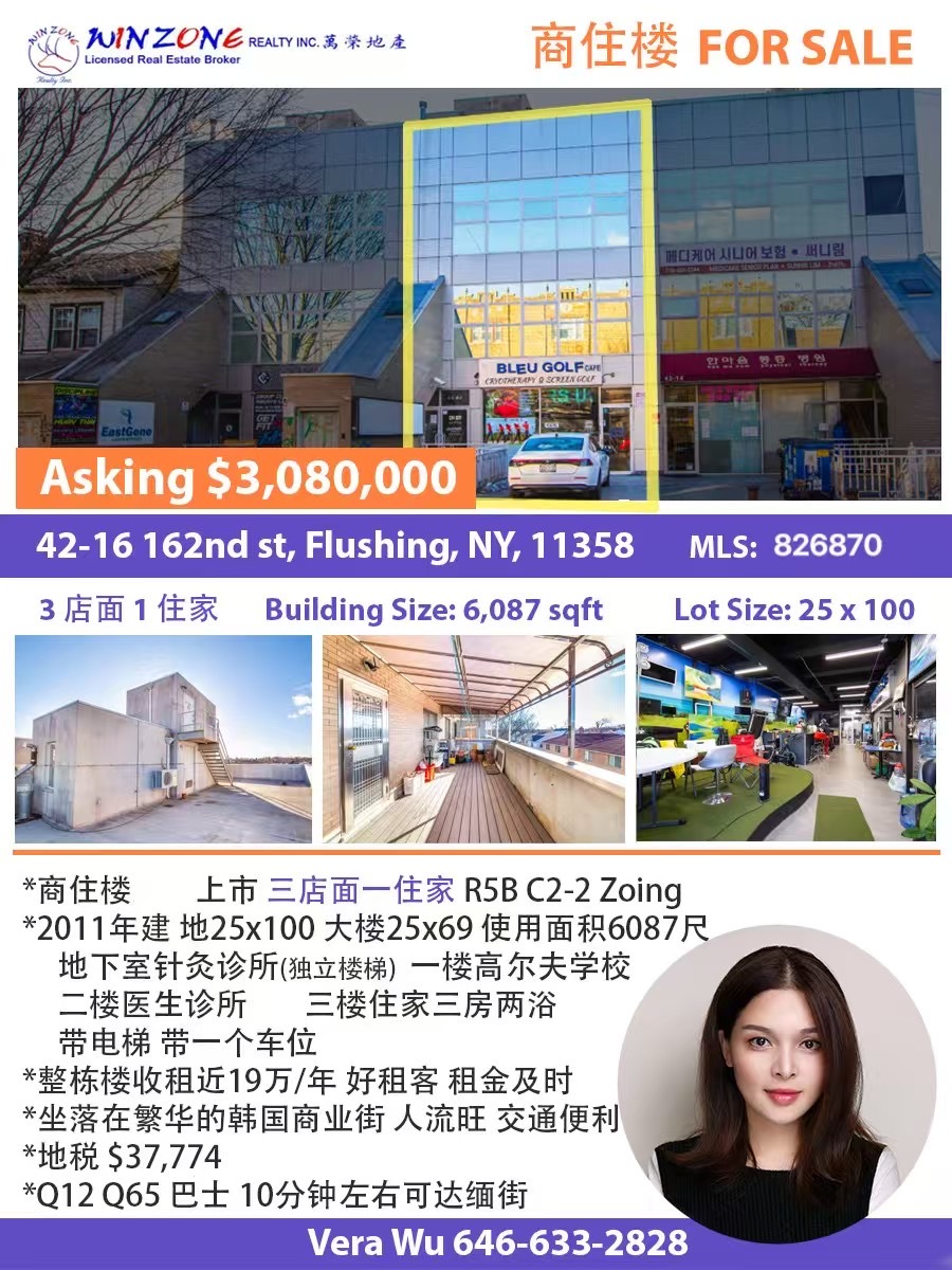 法拉盛42-16 162nd St 商住楼新上市 纽约法拉盛房屋出售 Flushing NY新上市法拉盛房子出售法拉盛豪华住宅独家出售买卖 2011年建地25✖️100 R5B C2-2 Zoing地税$37774/年 Building Size25✖️69 整栋楼面积6087尺 带电梯 带一个车位地下室针灸诊所(独立楼梯)一楼高尔夫学校二楼医生诊所 三楼住家三房两浴 带独立进出楼梯或乘电梯大阳台(可清空)整栋楼收租近19万/年 好租客 租金及时这栋楼坐落在繁华的韩国商业街 人流旺 交通便利 近超市 餐馆 长岛铁路Q12 Q65 巴士 10分钟左右可达缅街 生活十分便利 适合自住兼投资