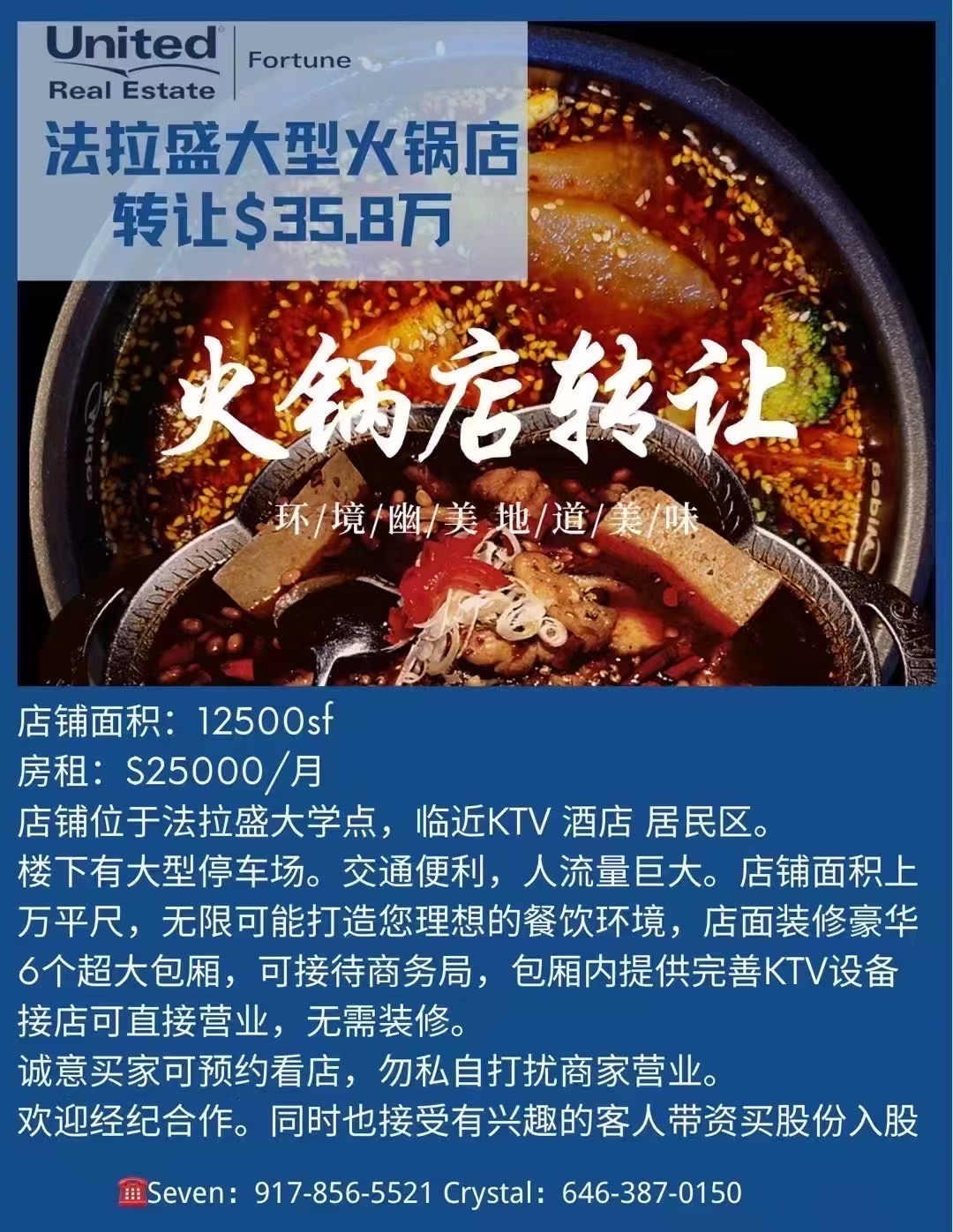 [庆祝][庆祝][庆祝]独家代理法拉盛大型火锅店转让Asking 💰358,000面积:12500sf房租:$25000/月