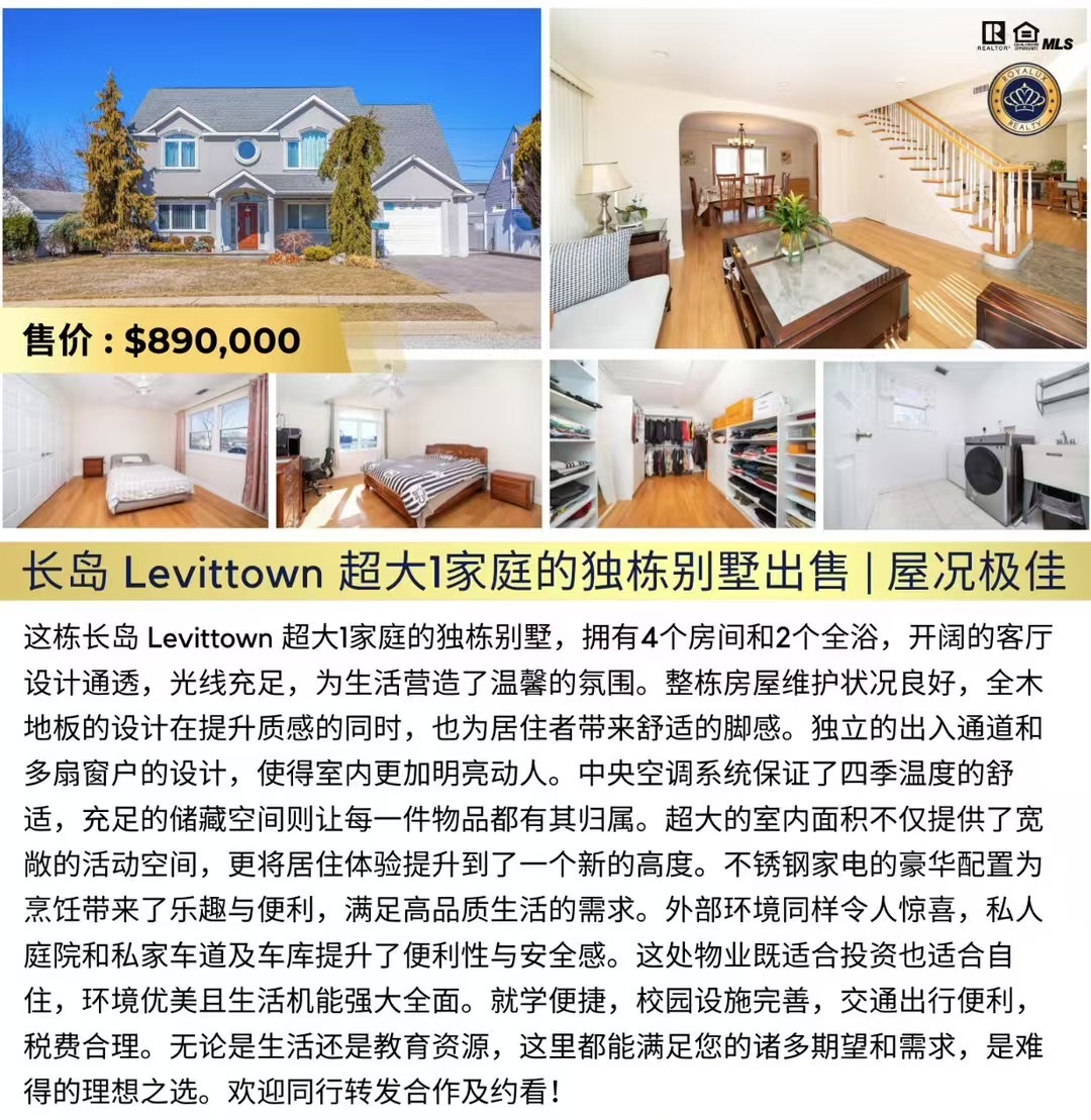 这栋长岛 Levittown 超大1家庭的独栋别墅,拥有4个房间和2个全浴,开阔的客厅设计通透,光线充足,为生活营造了温馨的氛围。整栋房屋维护状况良好,全木地板的设计在提升质感的同时,也为居住者带来舒适的脚感。独立的出入通道和多扇窗户的设计,使得室内更加明亮动人。中央空调系统保证了四季温度的舒适,充足的储藏空间则让每一件物品都有其归属。超大的室内面积不仅提供了宽敞的活动空间,更将居住体验提升到了一个新的高度。不锈钢家电的豪华配置为烹饪带来了乐趣与便利,满足高品质生活的需求。外部环境同样令人惊喜,私人庭院和私家车道及车库提升了便利性与安全感。这处物业既适合投资也适合自住,环境优美且生活机能强大全面。就学便捷,校园设施完善,交通出行便利,税费合理。无论是生活还是教育资源,这里都能满足您的诸多期望和需求,是难得的理想之选。📲约看请联系负责经纪:Sara:347-913-6868