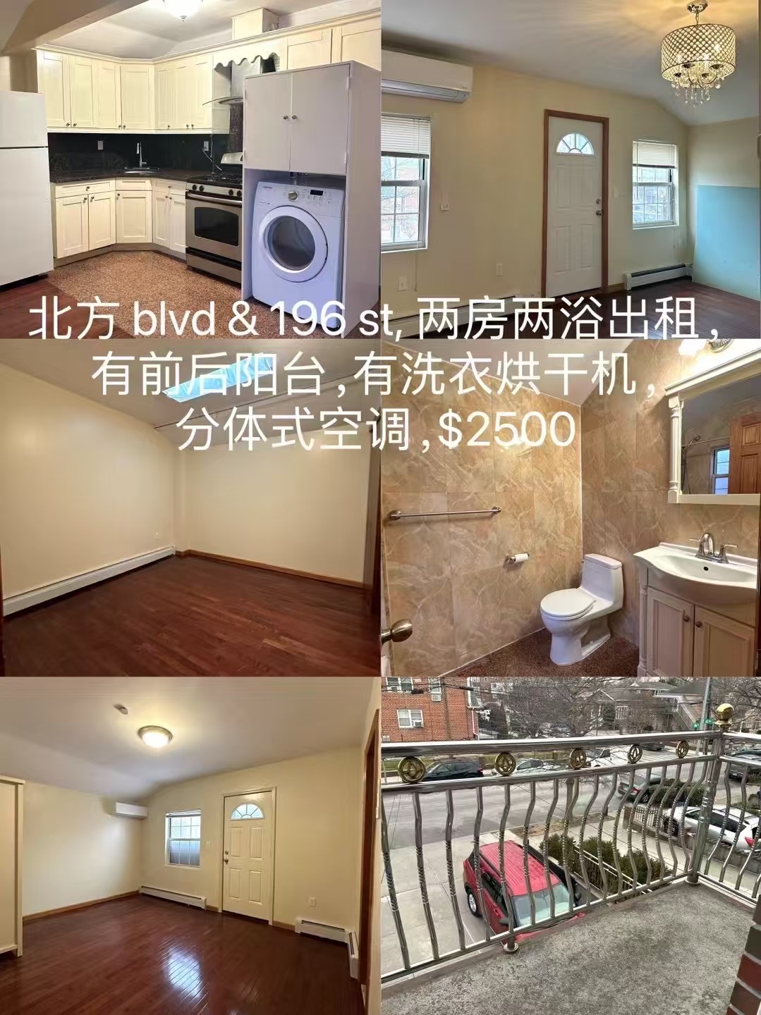 纽约法拉盛房屋住宅出租网法拉盛租房🎈最新出租🎈北方 blvd & 196 st, 两房两浴出租,有前后阳台,有洗衣烘干机,分体式空调, $2500 6463937424