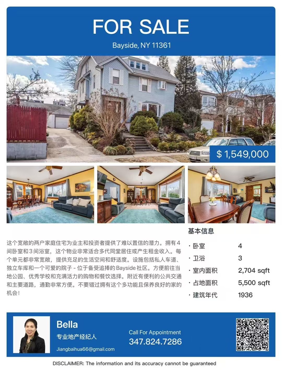 贝赛房屋出售Bayside NY新上市贝赛房屋出售 贝赛房子豪华住宅出售独家代理买卖北塞新上市一家庭154万9,4房3浴,使用面积2704尺,地5500尺,独立车位