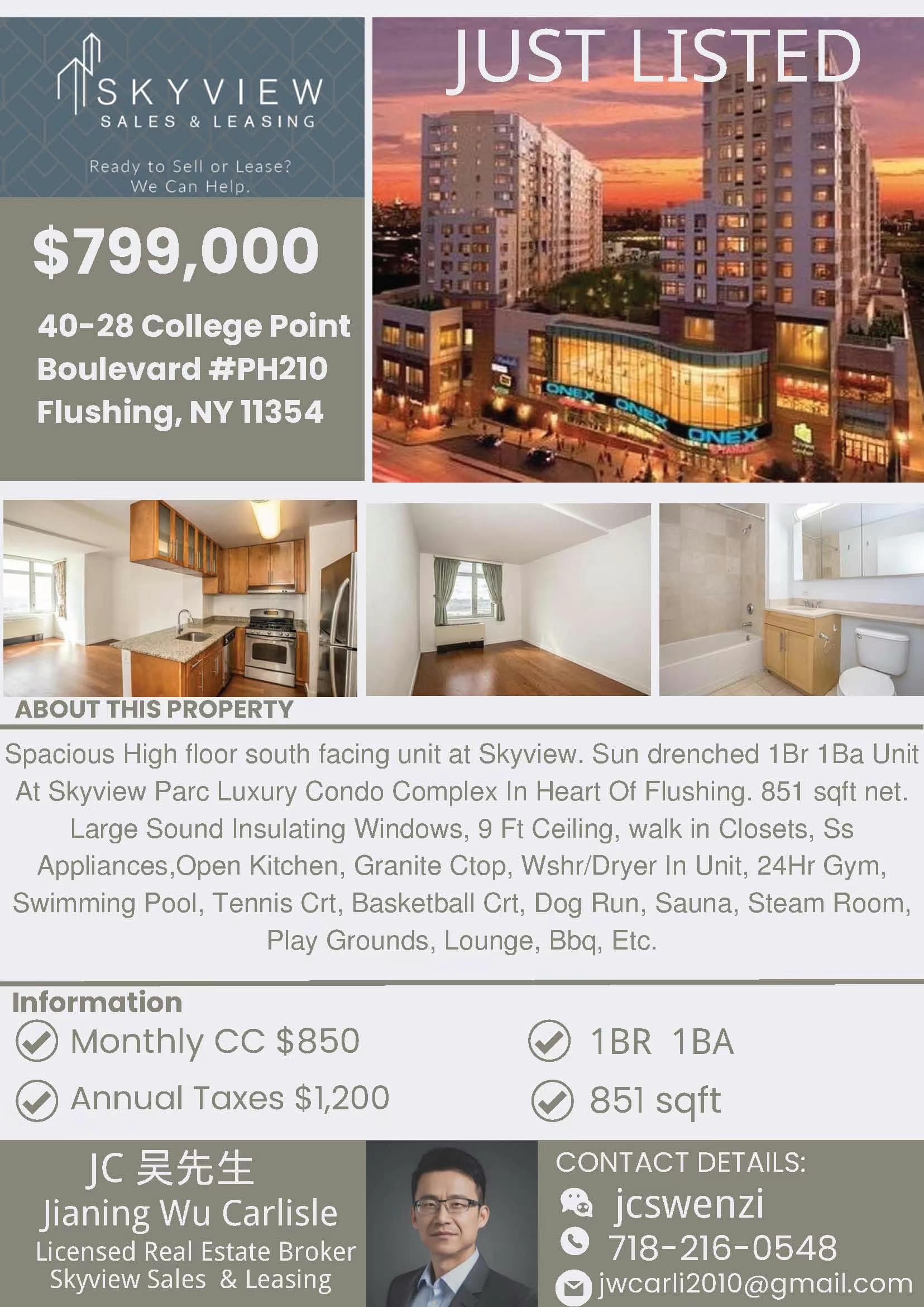 纽约法拉盛豪华康斗出售Flushing Luxury Condo NY 新上市法拉盛高档康斗出售法拉盛豪华康斗独家预售买卖 法拉盛Skyview 一期 朝南高楼层1房1厅带小书房户型出售- 刚刚降价到$79万9。 欢迎合作。 718-216-0548 微信 jcswenzi