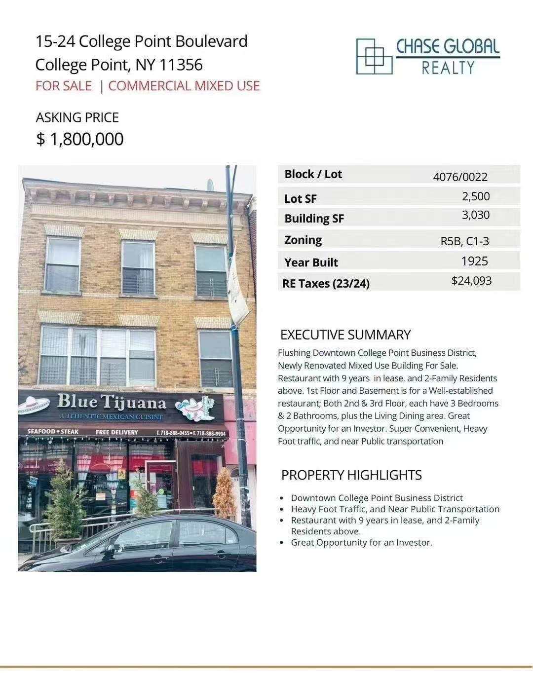 纽约大学点房子出售 College Point NY 新上市大学点房屋出售大学点豪宅独家出售买卖凯业地产代理,混合商住楼:餐馆 ➕ 全磚兩家庭!