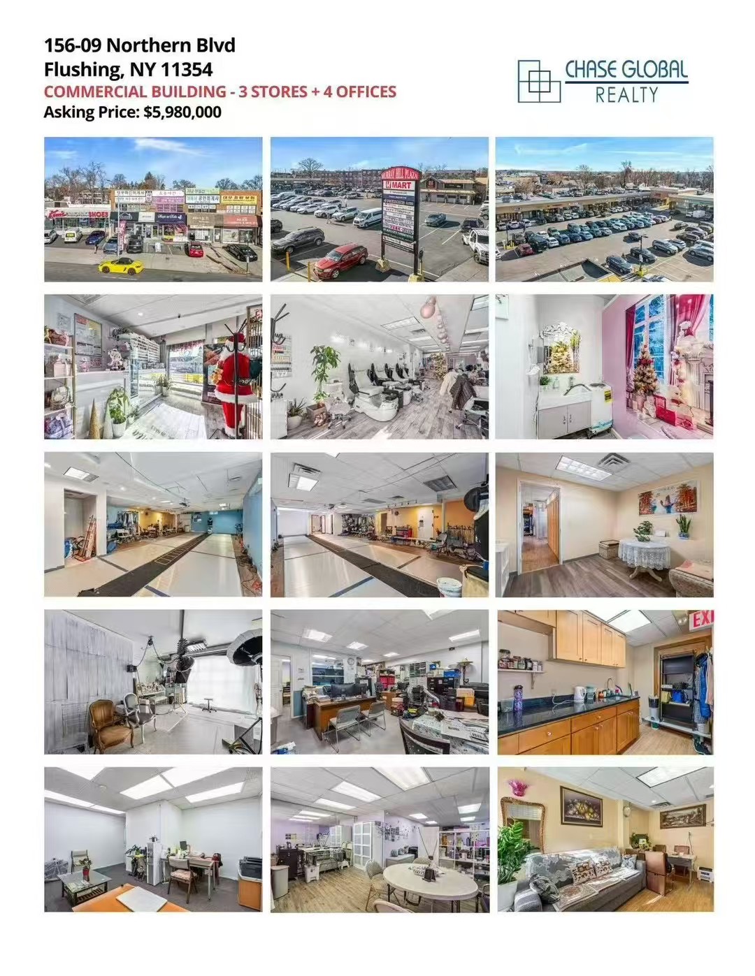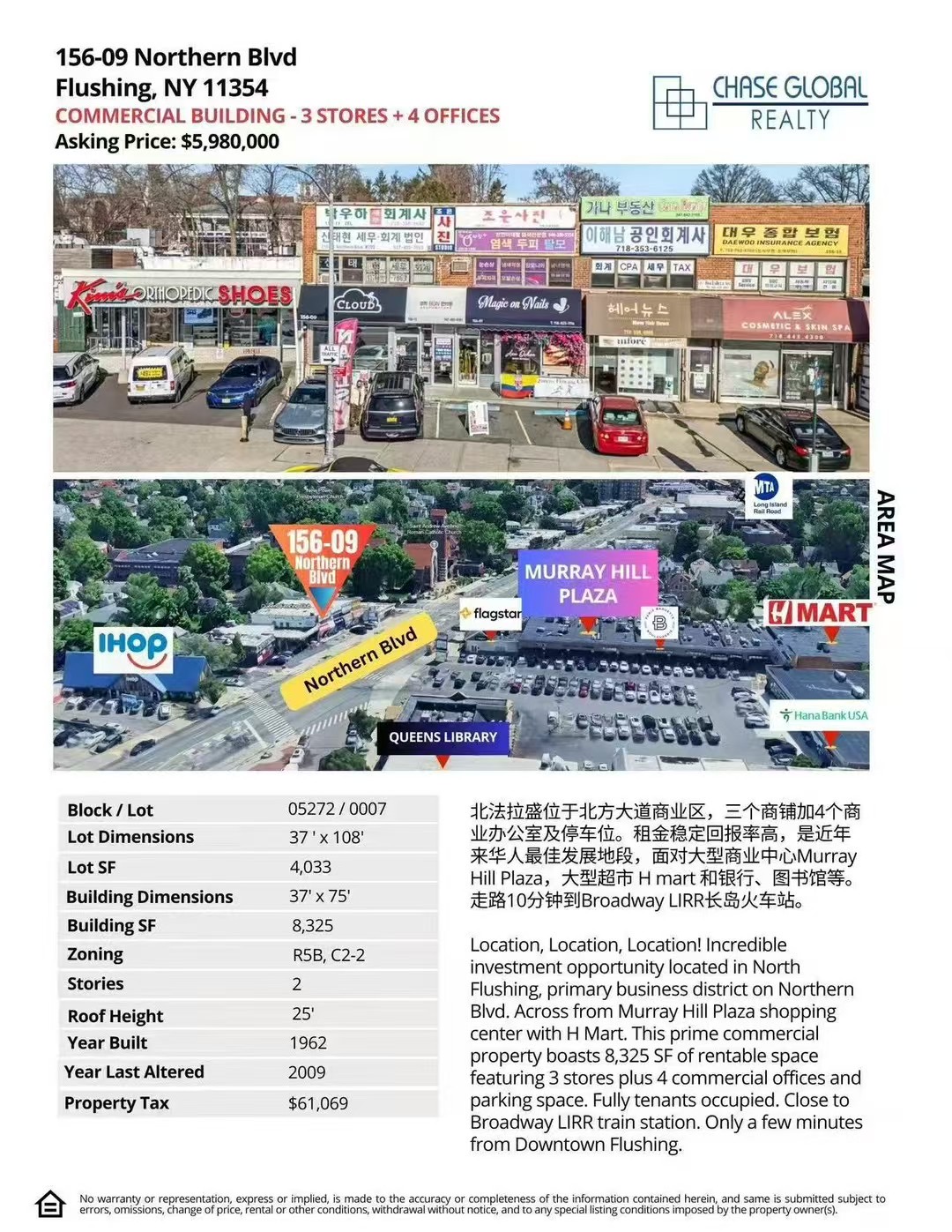Location, Location, Location! Incredible investment opportunity located in North Flushing, primary business district on Northern Blvd. Across from Murray Hill Plaza shopping center with H Mart. This prime commercial property boasts 8,325 SF of rentable space featuring 3 stores plus 4 commercial offices and parking space. Fully tenants occupied. Close to Broadway LIRR train station. Only a few minutes from Downtown Flushing.