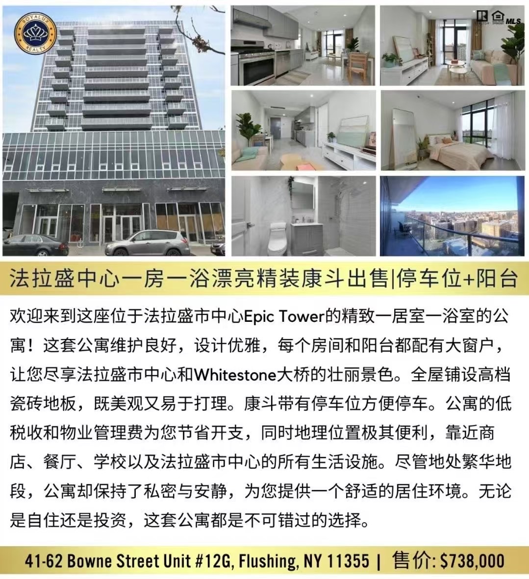 纽约法拉盛豪华康斗出售Flushing Luxury Condo NY 新上市法拉盛高档康斗出售法拉盛豪华康斗独家预售买卖 👑法拉盛中心一房一浴漂亮精装康斗出售 | 停车位+阳台 | 售价73.8万