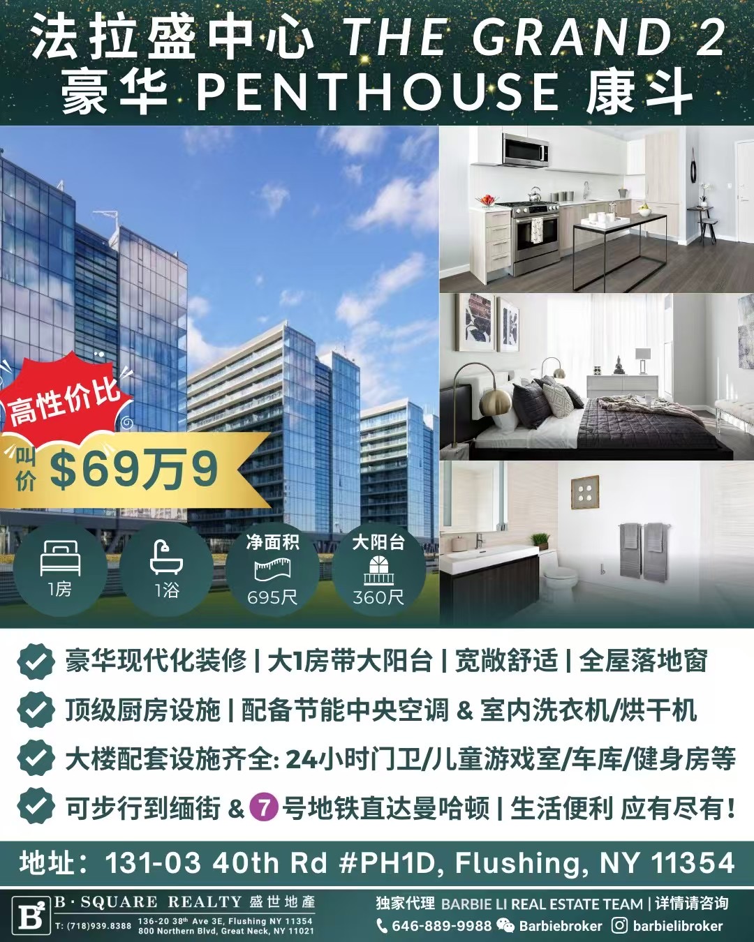 纽约法拉盛豪华康斗出售Flushing Luxury Condo NY 新上市法拉盛高档康斗出售法拉盛豪华康斗独家预售买卖 🔥【法拉盛中心The Grand 2豪华Penthouse康斗】🔥