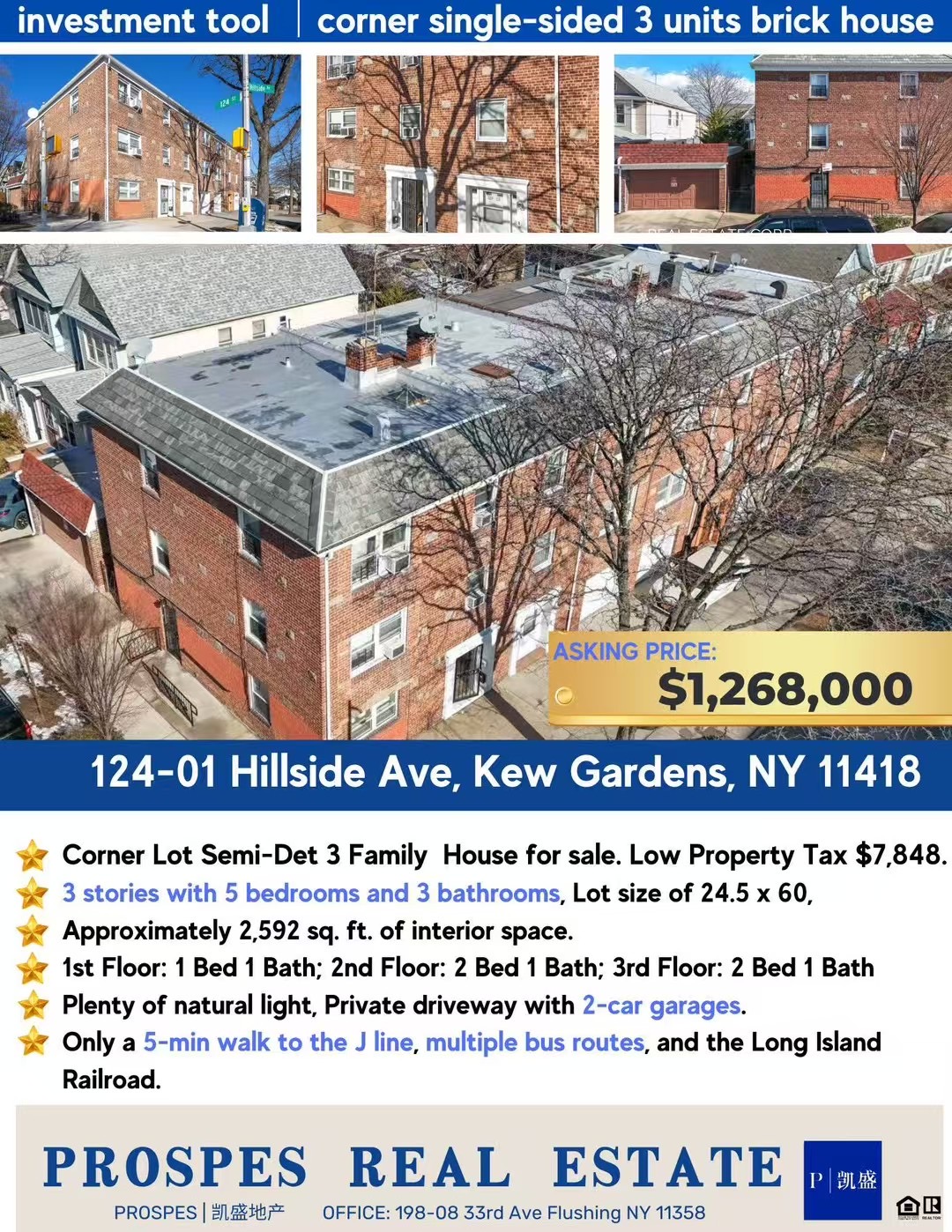 🔵Kew Gardens 街角砖房3家庭出售,低地税$7,848。