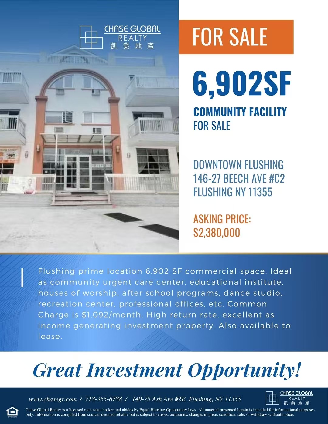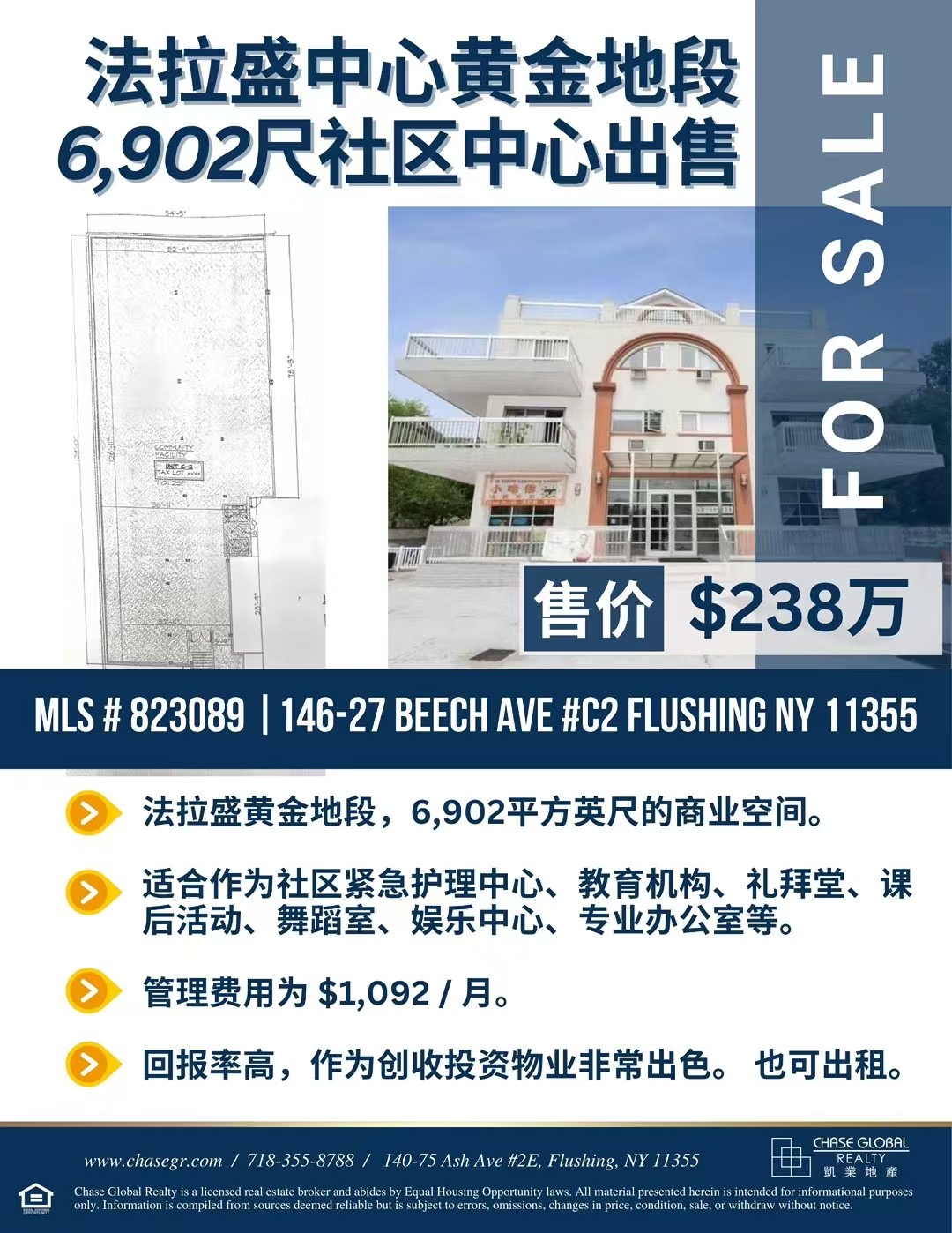 法拉盛老人中心业主退休急售!现成 7000尺空间,紧邻即将开业的老人中心,每日稳定客流,每呎仅300多,比建商成本还低!机会难得,欢迎咨询合作,转发有 SA2%