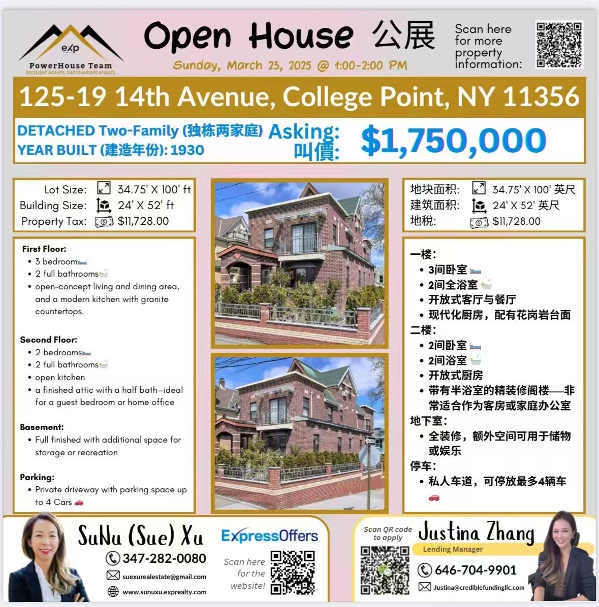 大学点别墅出售-大学点多家庭房出售-大学点新建房屋-大学点联排别墅出售-大学点房价走势好消息!好消息!❤️❤️❤️这个真的爱了😍纽约房东终于等到最喜欢特别难得的——🥳🥳独立两家庭砖房啦!!!明天公展大家一定要来看看🎈Sunday March 23rd, 1:00-2:00pm🏡 大学点独栋两家庭📍 125-19 14th Ave, College Point, NY 11356💰 售价:$1,750,000✅ 2011年建造,东南朝向✅ 建筑面积:24x52 | 土地面积:34.75x100✅ 一楼: 3卧2卫✅ 二楼: 3卧2.5卫,带精装修阁楼及半卫,可用作客房或办公室✅ 现代开放式厨房,不锈钢电器 & 花岗岩台面✅ 宽敞客厅,大窗户采光充足✅ 全地下室,✅ 私人车道可停2-4辆车✅ 天然气系统 | 2个锅炉 | 2个热水器✅ 靠近购物中心,交通便利,紧邻高速公路📲 适合首次购房者或投资者!欢迎私信咨询或预约看房!Sue 徐347-282-0080贷款找我:646-704-9901👏👏👏欢迎同行合作转发