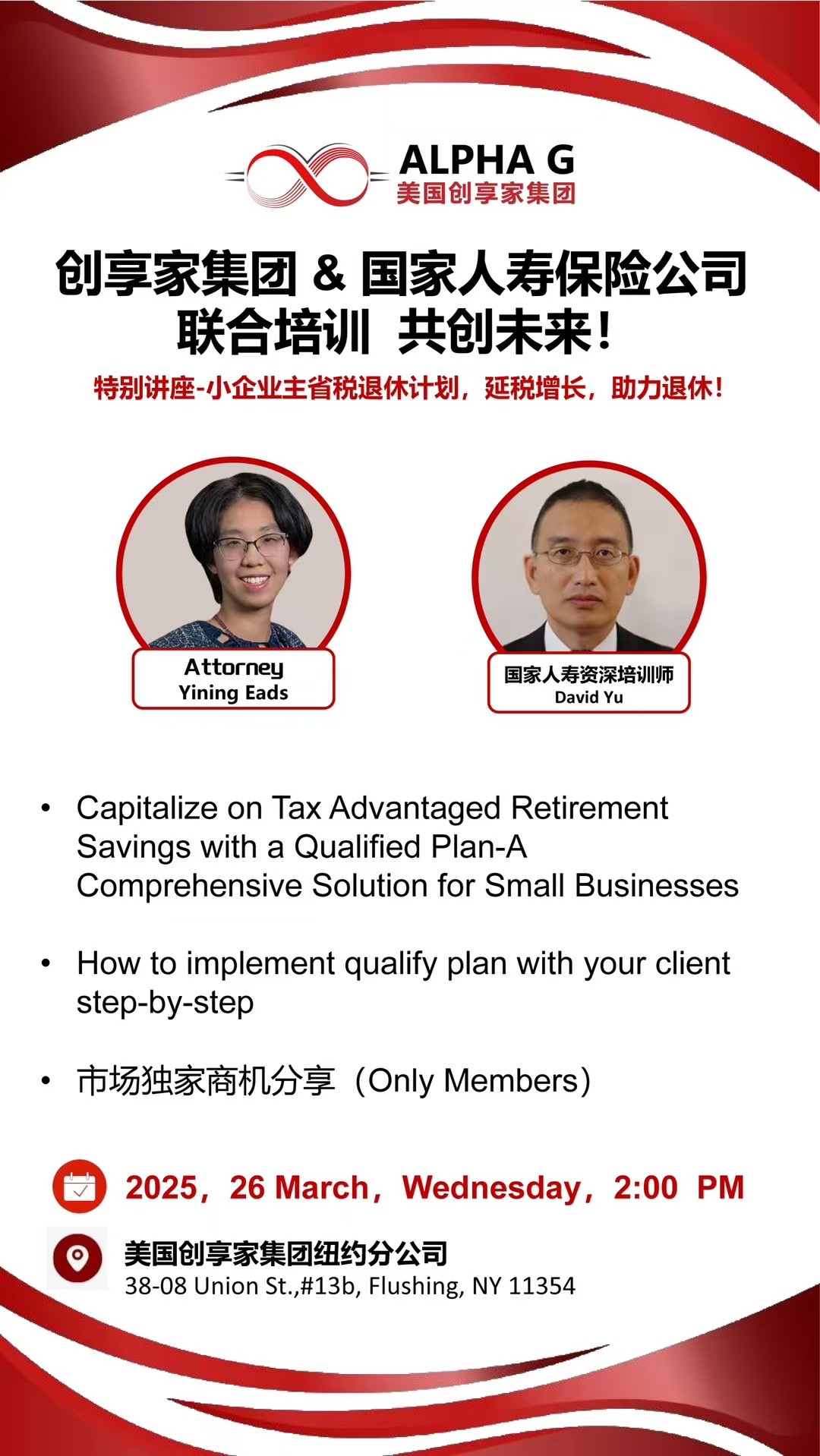 创享家集团携手国家人寿保险公司,重磅推出特别讲座 —— 小企业主省税退休计划!地址:3808 Union St Suite 13B Flushing NY 11354通过这个讲座,您能精准掌握利用合格退休储蓄计划获取税收优惠的窍门,实现财富延税稳健增长!对于高收入的公司 我们会教你你如果通过合理的规划 为公司省税 同时帮助老板累计满满都退休金我们不仅有一站式解决方案,还会细致拆解每一步实施要点!请私信我留座