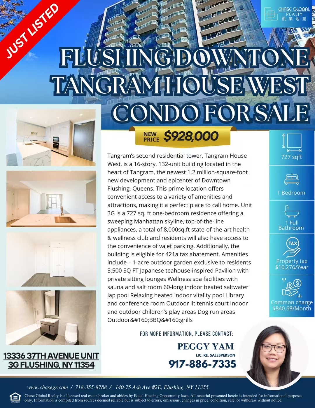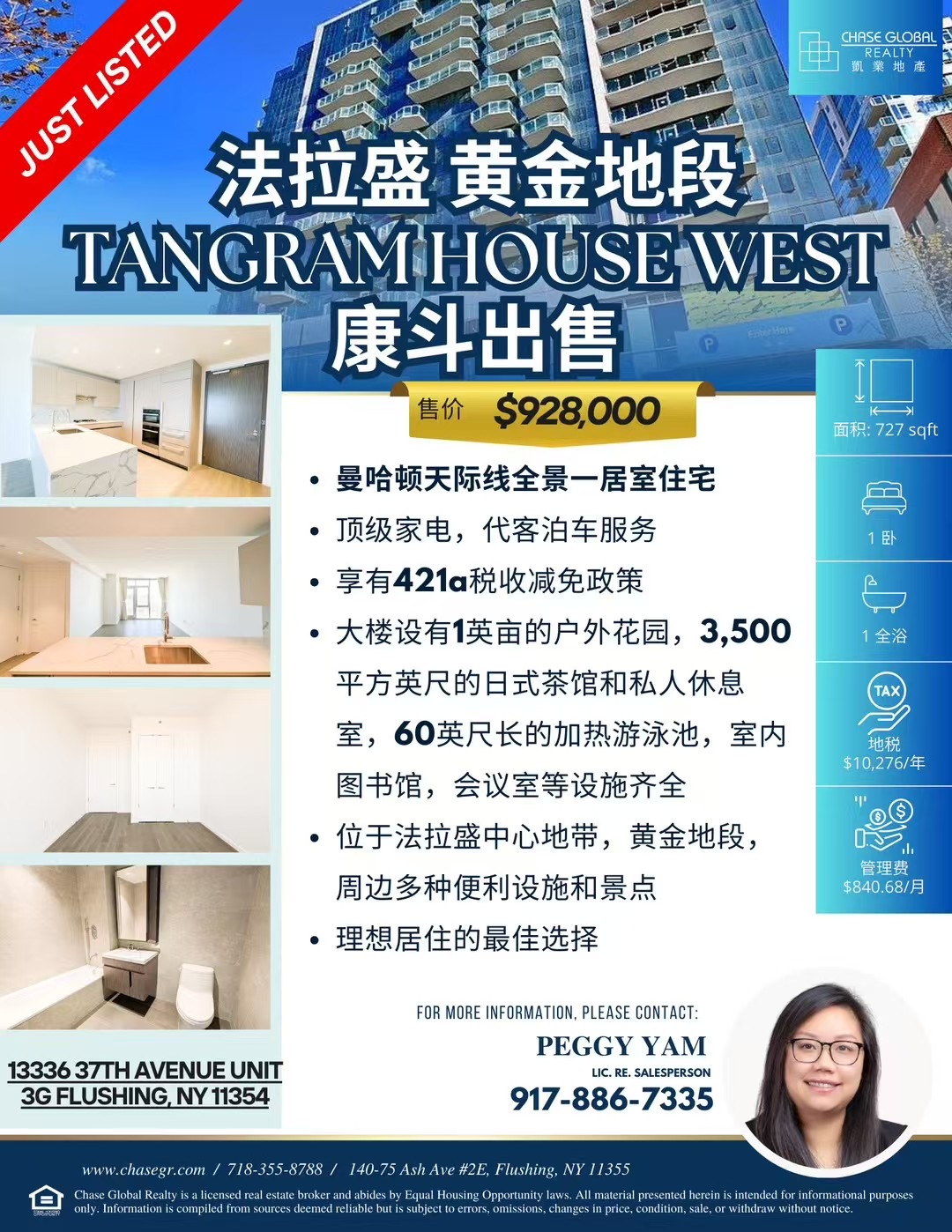 法拉盛重磅推出 | TANGRAM HOUSE WEST 一居室康斗法拉盛黄金地段 🏙️ 曼哈顿天际线全景视野 🌆💰 售价:$928,000✨ 顶级家电配备,享受奢华生活🚗 提供代客泊车服务,生活更便捷